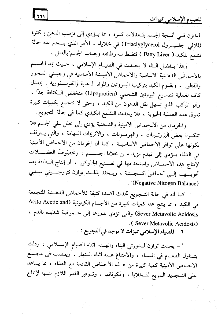 وهذا بفضل الله لا يحدث في الصيام الإسلامي، حيث يمد الجسم بالأحماض الدهنية الأساسية والأحماض الأمينية الأساسية في وجبتي السحور والفطور، ويقوم الكبد بتركيب البروتين والمواد الدهنية والفوسفورية، بمعدل كاف لعملية تصنيع البروتين الشحمي (Lipoprotin) منخفض الكثافة جدًا، وهو المركب الذي يسهل نقل الدهون من الكبد، وحتى لا تتجمع بكميات كبيرة تعوق هذه العملية الحيوية، فلا يحدث التشمع الكبدي كما في حالة التجويع.