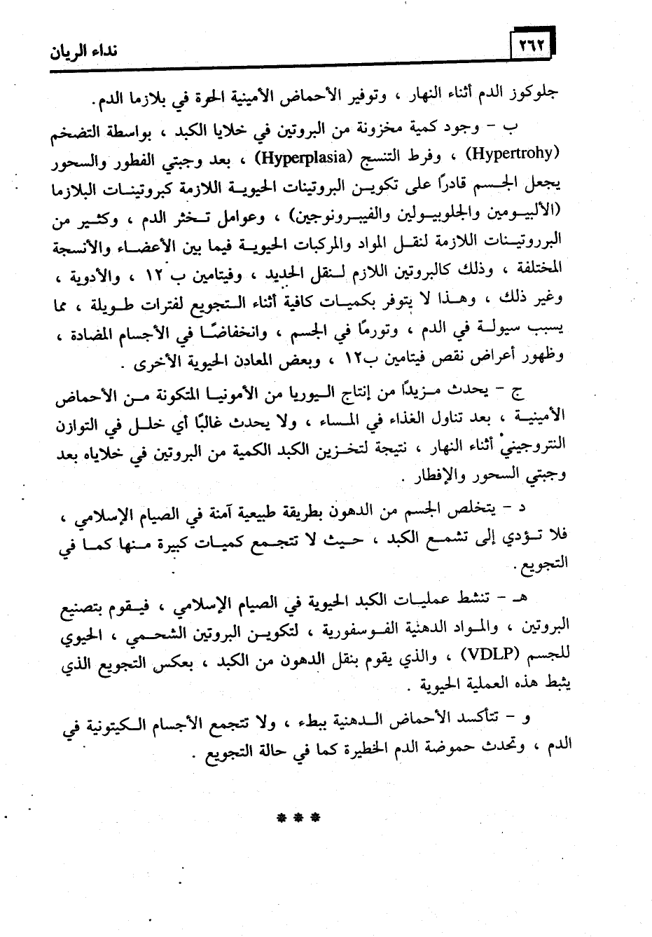 هـ- تنشط عمليات الكبد الحيوية في الصيام الإسلامي، فيقوم بتصنيع البروتين، والمواد الدهنية الفوسفورية، لتكوين البروتين الشحمي، الحيوي