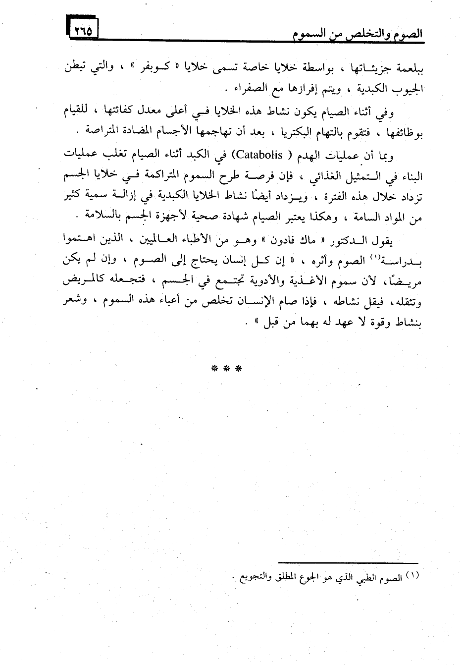 وبما أن عمليات الهدم (Catabolis) في الكبد أثناء الصيام تغلب عمليات البناء في التمثيل الغذائي، فإن فرصة طرح السموم المتراكمة في خلايا الجسم تزداد خلال هذه الفترة، ويزداد أيضاً نشاط الخلايا الكبدية في إزالة سمية كثير من المواد السامة، وهكذا يعتبر الصيام شهادة صحية لأجهزة الجسم بالسلامة.