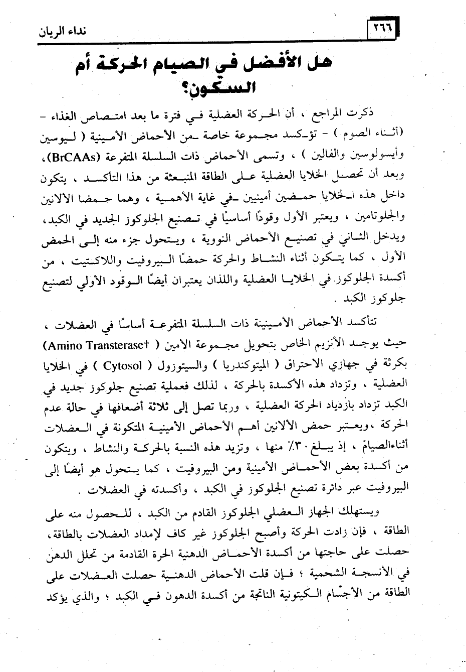 ذكرت المراجع، أن الحركة العضلية في فترة ما بعد امتصاص الغذاء - (أثناء الصوم) - تؤكسد مجموعة خاصة من الأحماض الأمينية (ليوسين وأيسولوسين والفالين) ، وتسمى الأحماض ذات السلسلة المتفرعة (BrCAAs) ، وبعد أن تحصل الخلايا العضلية على الطاقة المنبعثة من هذا التأكسد، يتكون داخل هذه ا-لخلايا حمضين أمينيين -في غاية الأهمية، وهما حمضا الألانين والجلوتامين، ويعتبر الأول وقودًا أساسيًا في تصنيع الجلوكوز الجديد في الكبد، ويدخل الثاني في تصنيع الأحماض النووية، ويتحول جزء منه إلى الحمض الأول، كما يتكون أثناء النشاط والحركة حمضًا البيروفيت واللاكتيت، من أكسدة الجلوكوز. في الخلايا العضلية واللذان يعتبران أيضاً الوقود الأولي لتصنيع جلوكوز الكبد.
