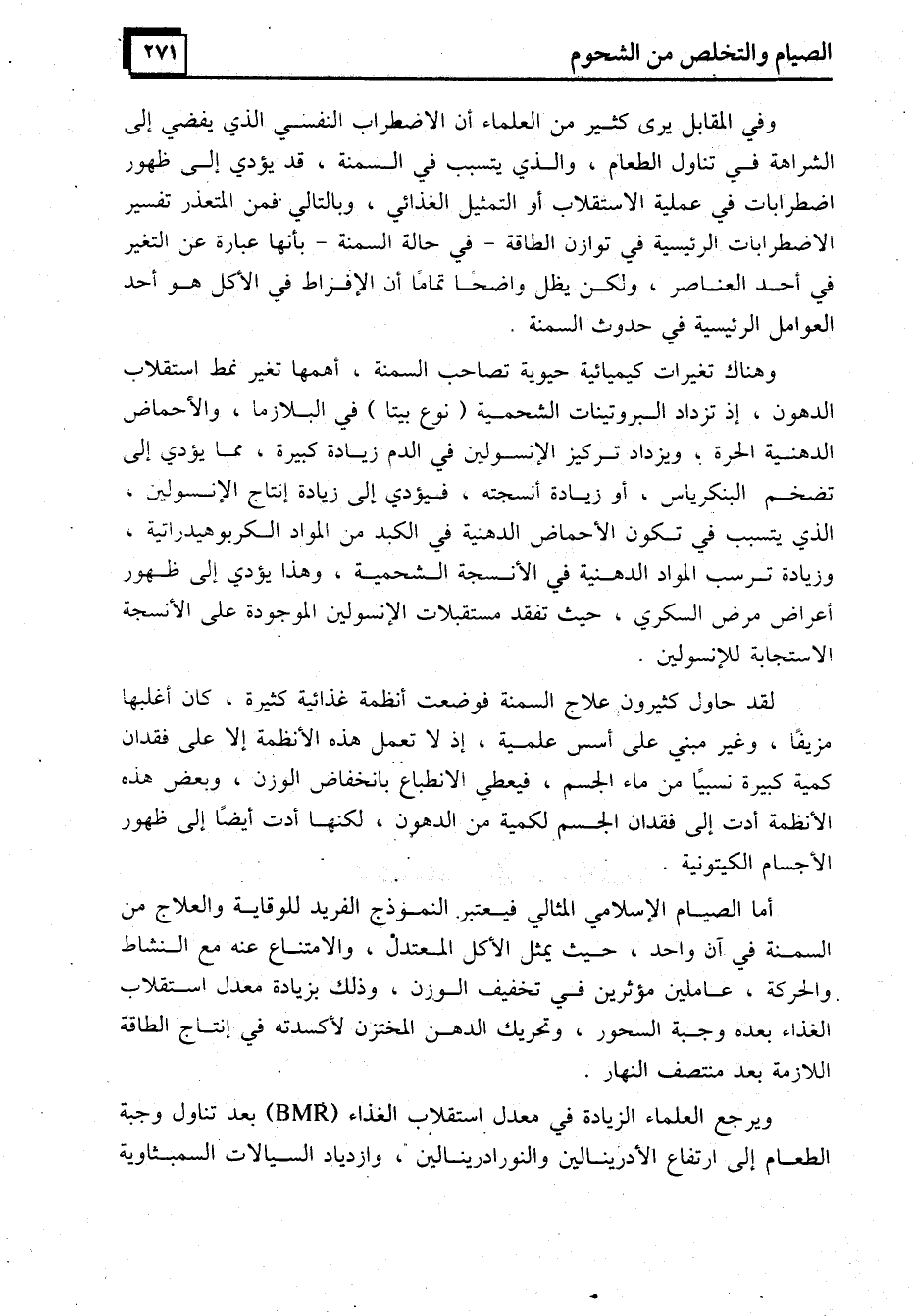أما الصيام الإسلامي المثالي يعتبر. النموذج الفريد للوقاية والعلاج من السمنة في آن واحد، حيث يمثل الأكل المعتدل، والامتناع عنه مع النشاط والحركة، عامدين مؤثرين في تخفيف الوزن، وذلك بزيادة معدل استقلاب الغذاء بعده وجبة السحور، وتحريك الدهن المختزن لأكسدته في إنتاج الطاقة اللازمة بعد منتصف النهار.