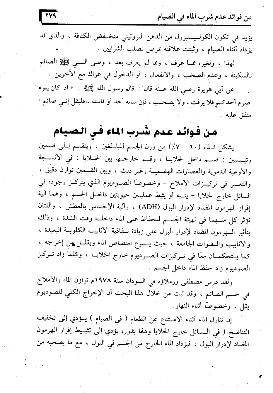 ولقد درس مصطفى وزملاؤه في السودان سنة 1978م توازن الماء والأملاح في جسم الصائم، وقد ثبت من خلال هذا البحث أن الإخراج الكلي للصوديوم يقل، وخصوصًا أثناء النهار.