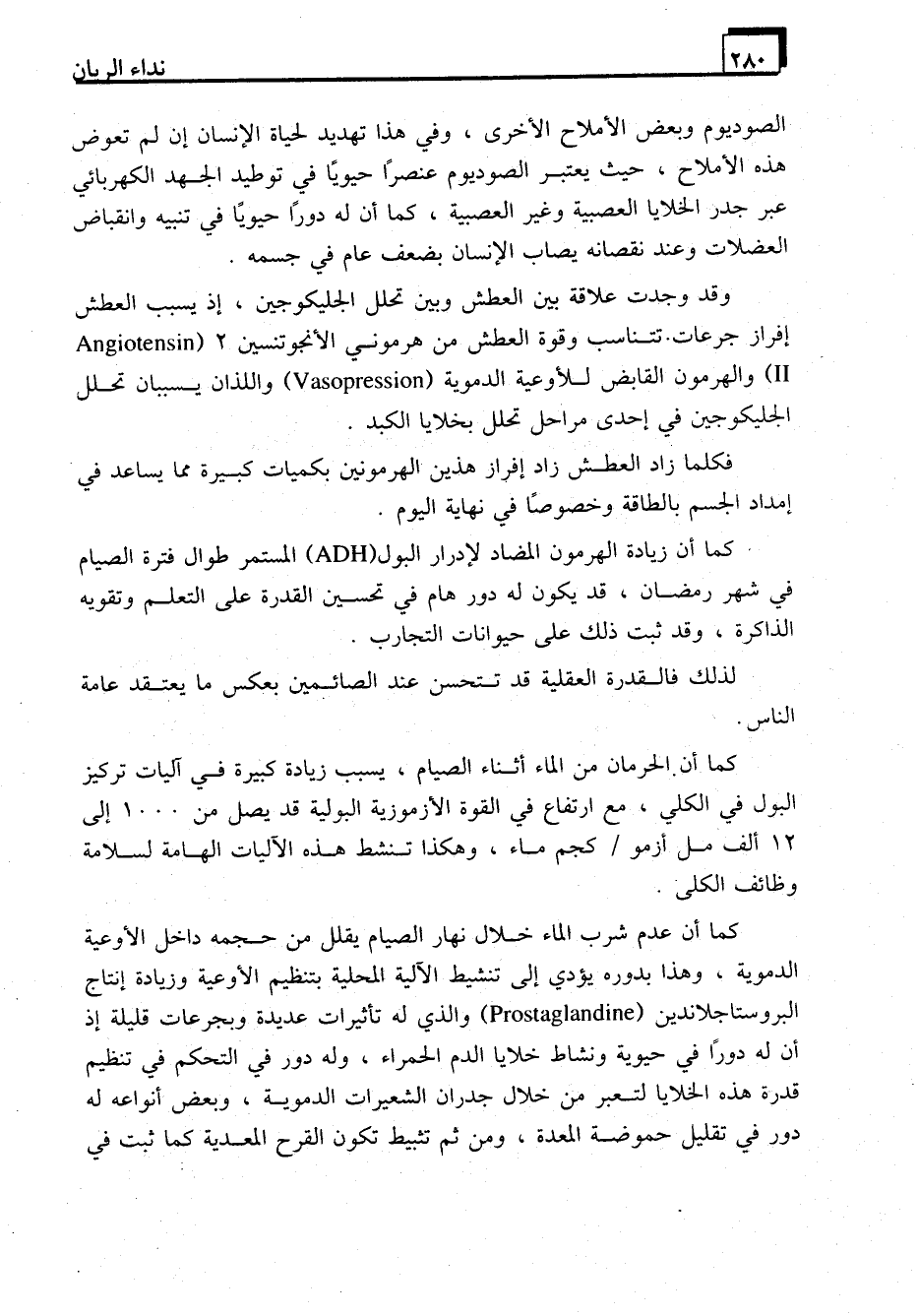 كما أن زيادة الهرمون المضاد لإدرار البول (ADH) المستمر طوال فترة الصيام في شهر رمضان، قد يكون له دور هام في تحسين القدرة على التعلم وتقويه الذاكرة، وقد ثبت ذلك على حيوانات التجارب.