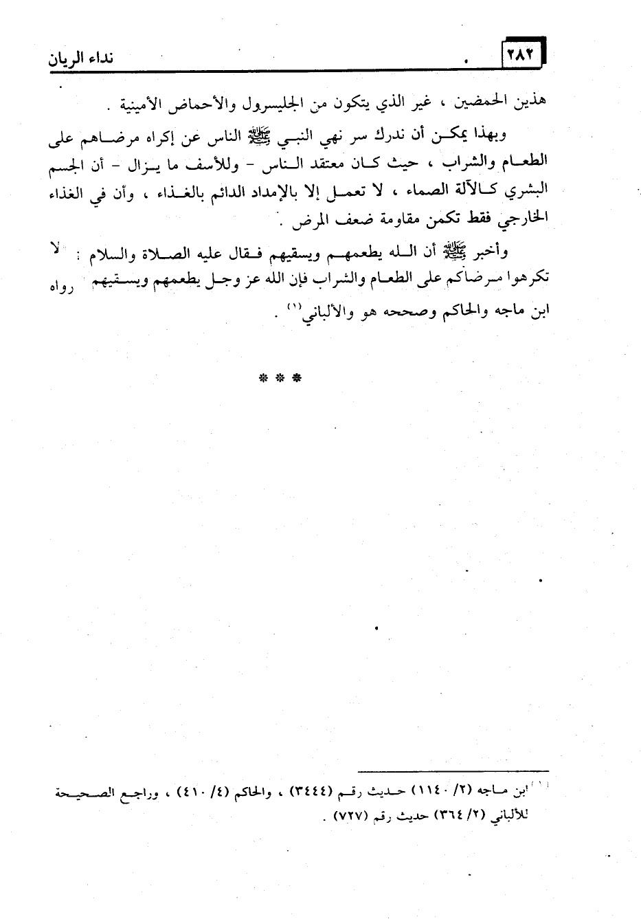 وأخبر - صَلَّى اللَّهُ عَلَيْهِ وَسَلَّمَ - أن الله يطعمهم ويسقيهم فقال عليه الصلاة والسلام: "لا تكرهوا مرضاكم على الطعام والشراب فإن الله عز وجل يطعمهم ويسقيهم" رواه ابن ماجه والحاكم وصححه هو والألباني (1) .
