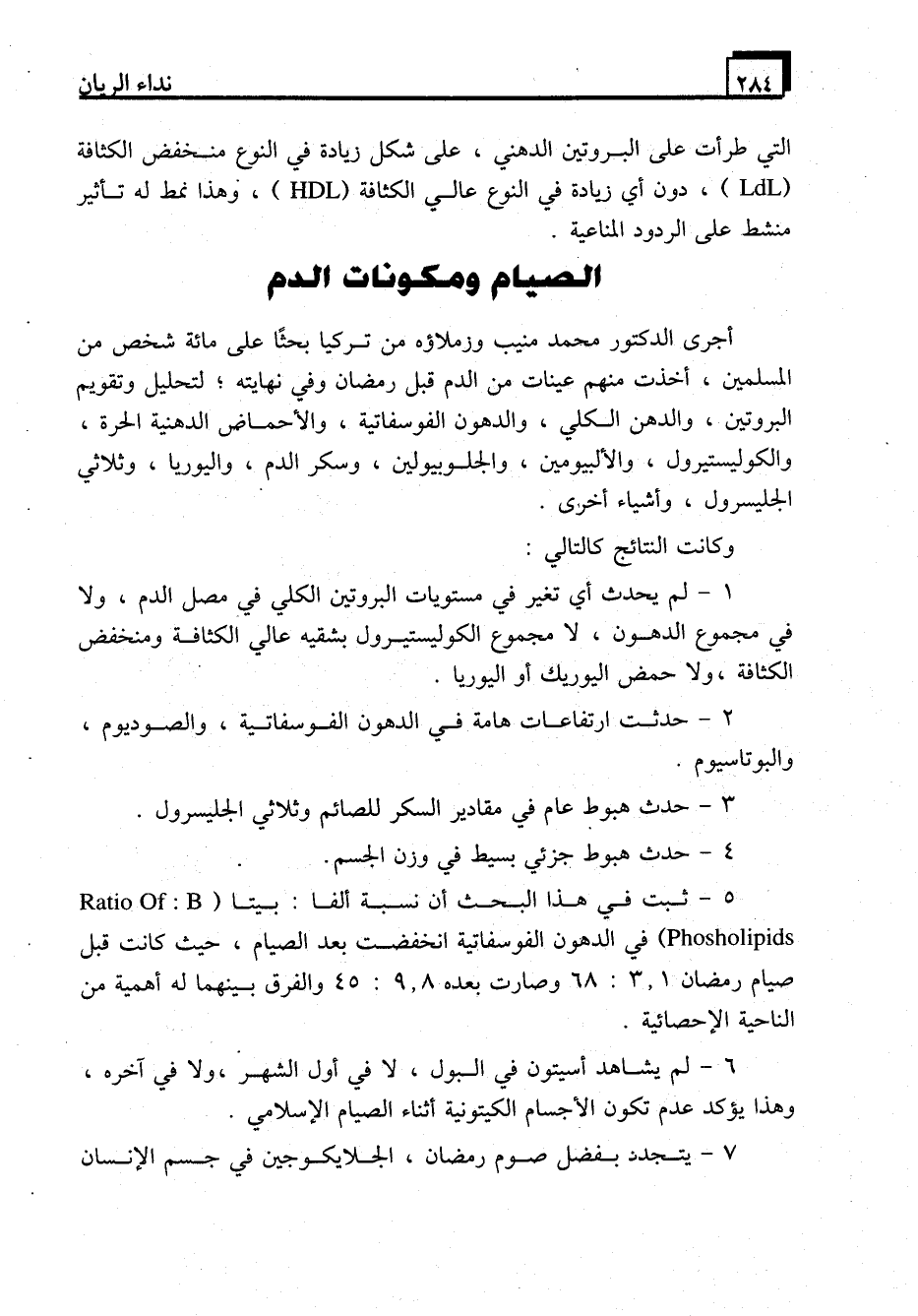 5- ثبت في هذا البحث أن نسبة ألفا: بيتا (Ratio Of: B Phosholipids) في الدهون الفوسفاتية انخفضت بعد الصيام، حيث كانت قبل صيام رمضان 3.1: 68 وصارت بعده 9.8: 45 والفرق بينهما له أهمية من الناحية الإحصائية.