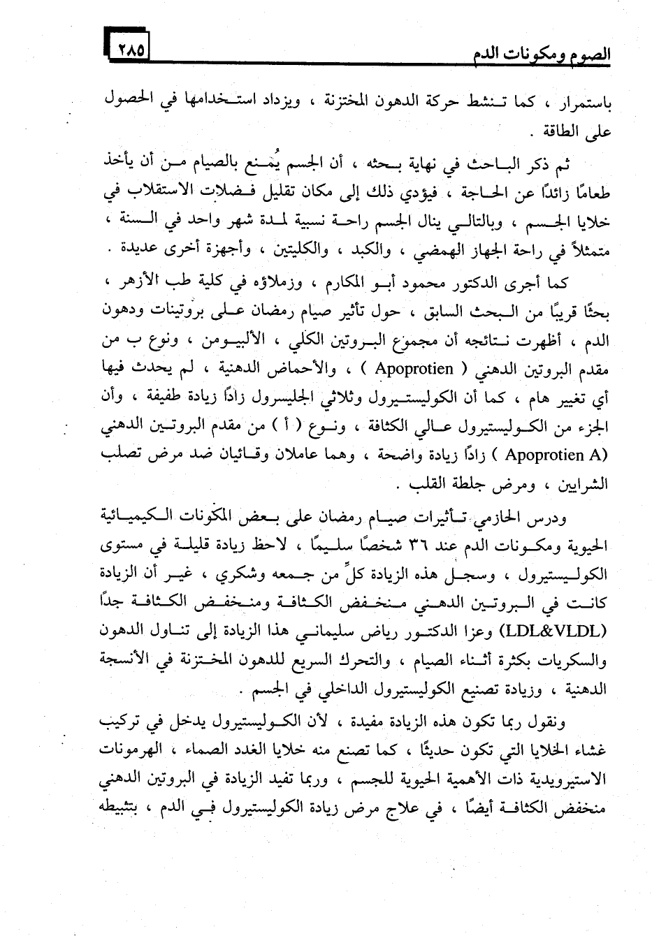 كما أجرى الدكتور محمود أبو المكارم، وزملاؤه في كلية طب الأزهر، بحثًا قريبًا من البحث السابق، حول تأثير صيام رمضان على بروتينات ودهون الدم، أظهرت نتائجه أن مجموع البروتين الكلي، الألبيومين، ونوع ب من مقدم البروتين الدهني (Apoprotien) ، والأحماض الدهنية، لم يحدث فيها أي تغيير هام، كما أن الكوليستيرول وثلاثي الجليسرول زادًا زيادة طفيفة، وأن الجزء من الكوليستيرول عالي الكثافة، ونوع (أ) من مقدم البروتين الدهني (Apoprotien A) زادًا زيادة واضحة، وهما عاملان وقائيان ضد مرض تصلب الشرايين، ومرض جلطة القلب.