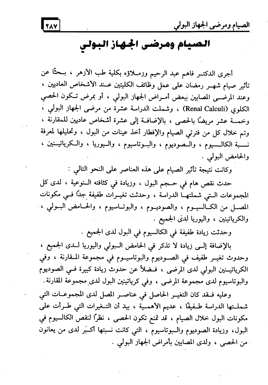 أجرى الدكتور فاهم عبد الرحيم وزملاؤه بكلية طب الأزهر، بحثًا عن تأثير صيام شهر رمضان على عمل وظائف الكليتين عند الأشخاص العاديين، وعند المرضى المصابين ببعض أمراض الجهاز البولي، أو بمرض تكون الحصى الكلوي (Renal Calculi) ، وشملت الدراسة عشرة من مرضى الجهاز البولي، وخمسة عشر مريضاً بالحصى، بالإضافة إلى عشرة أشخاص عاديين للمقارنة، وتم خلال كل من فترتي الصيام والإفطار أخذ عينات من البول، وتحليلها لمعرفة نسبة الكالسيوم، والصوديوم، والبوتاسيوم، واليوريا، والكرياتينين، والحامض البولي.