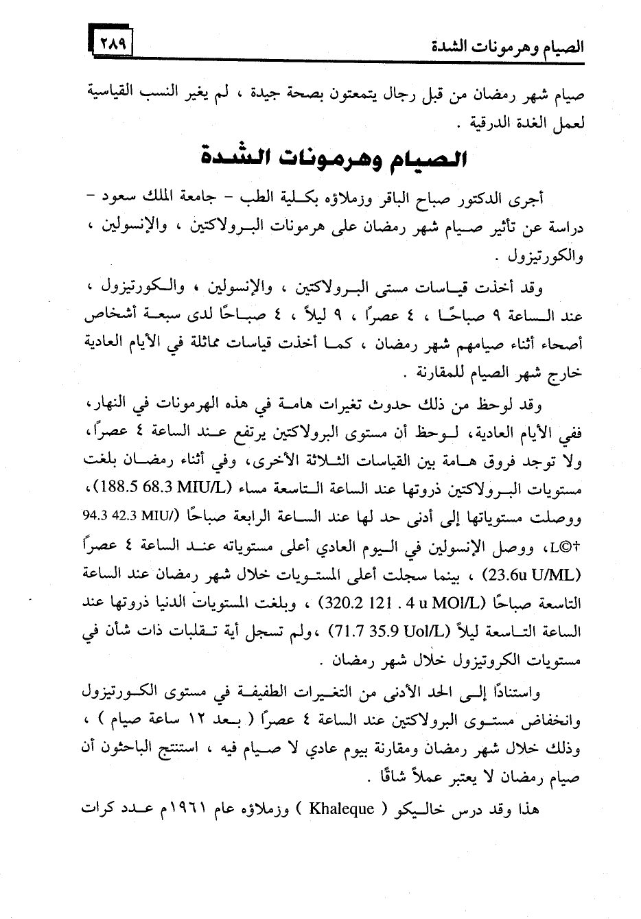 أجرى الدكتور صباح الباقر وزملاؤه بكلية الطب -جامعة الملك سعود- دراسة عن تأثير صيام شهر رمضان على هرمونات البرولاكتين، والإنسولين، والكورتيزول.