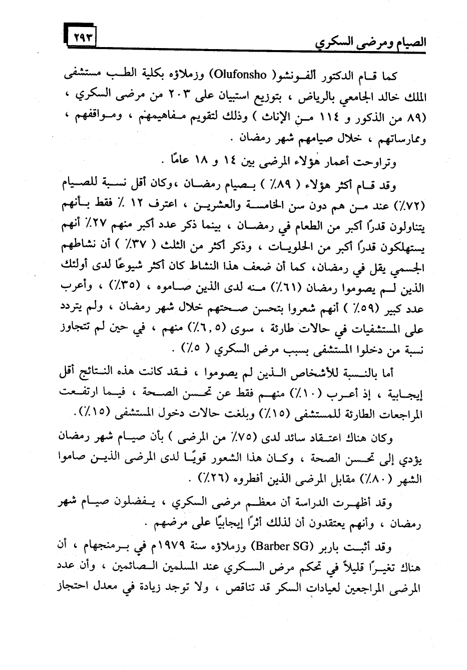وقد أثبت باربر (Barber SG) وزملاؤه سنة 1979م في برمنجهام، أن هناك تغيرًا قليلاً في تحكم مرض السكري عند المسلمين الصائمين، وأن عدد المرضى المراجعين لعيادات السكر قد تناقص، ولا توجد زيادة في معدل احتجاز