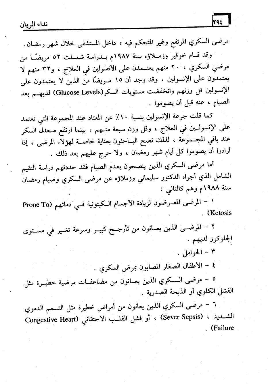 أما مرضى السكري الذين ينصحون بعدم الصيام فقد حددتهم دراسة التقييم الشامل الذي أجراه الدكتور سليماني وزملاؤه عن مرضى السكري وصيام رمضان سنة 1988م وهم كالتالي: