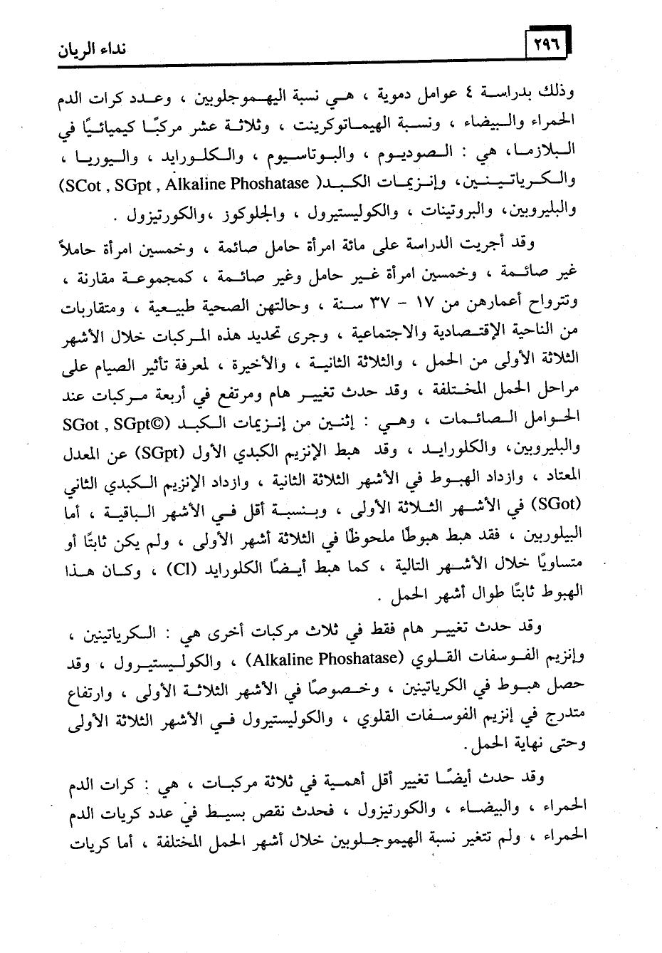 وقد أجريت الدراسة على مائة امرأة حامل صائمة، وخمسين امرأة حاملاً غير صائمة، وخمسين امرأة غير حامل وغير صائمة، كمجموعة مقارنة، وتتراوح أعمارهن من 17-37 سنة، وحالتهن الصحية طبيعية، ومتقاربات من الناحية الاقتصادية والاجتماعية، وجرى تحديد هذه المركبات خلال الأشهر الثلاثة الأولى من الحمل، والثلاثة الثانية، والأخيرة، لمعرفة تأثير الصيام على مراحل الحمل المختلفة، وقد حدث تغيير هام ومرتفع في أربعة مركبات عند الحوامل الصائمات، وهي: إثنين من إنزيمات الكبد (©Sgot , SGpt) والبليروبين، والكلورايد، وقد هبط الإنزيم الكبدي الأول (SGpt) عن المعدل المعتاد، وازداد الهبوط في الأشهر الثلاثة الثانية، وازداد الإنزيم الكبدي الثاني (SGot) في الأشهر الثلاثة الأولى، وبنسبة أقل في الأشهر الباقية، أما البيلوربين، فقد هبط هبوطا ملحوظا في الثلاثة أشهر الأولى، ولم يكن ثابتًا أو متساويًا خلال الأشهر التالية، كما هبط أيضاً الكلورايد (CI) ، وكان هذا الهبوط ثابتًا طوال أشهر الحمل.