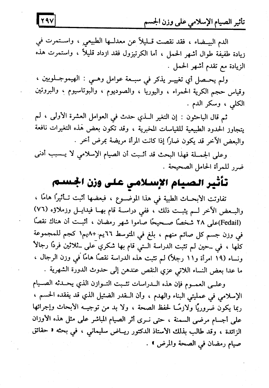 وعلى العموم فإن هذه الدراسات تثبت التوازن الذي يحدثه الصيام الإسلامي في عمليتي البناء والهدم، وأن القدر الضئيل الذي قد يفقده الحسم، ربما يكون ضروريِّا ولازمًا لحفظ الصحة، ولابد من توجيه الأبحاث وإجرائها على أجسام مرضى السمنة، حتى نرى أثر الصيام المباشر على مثل هذه الأوزان الزائدة، وقد طالب بذلك الأستاذ الدكتور رياض سليماني، في بحثه "حقائق صيام رمضان في الصحة والمرض".