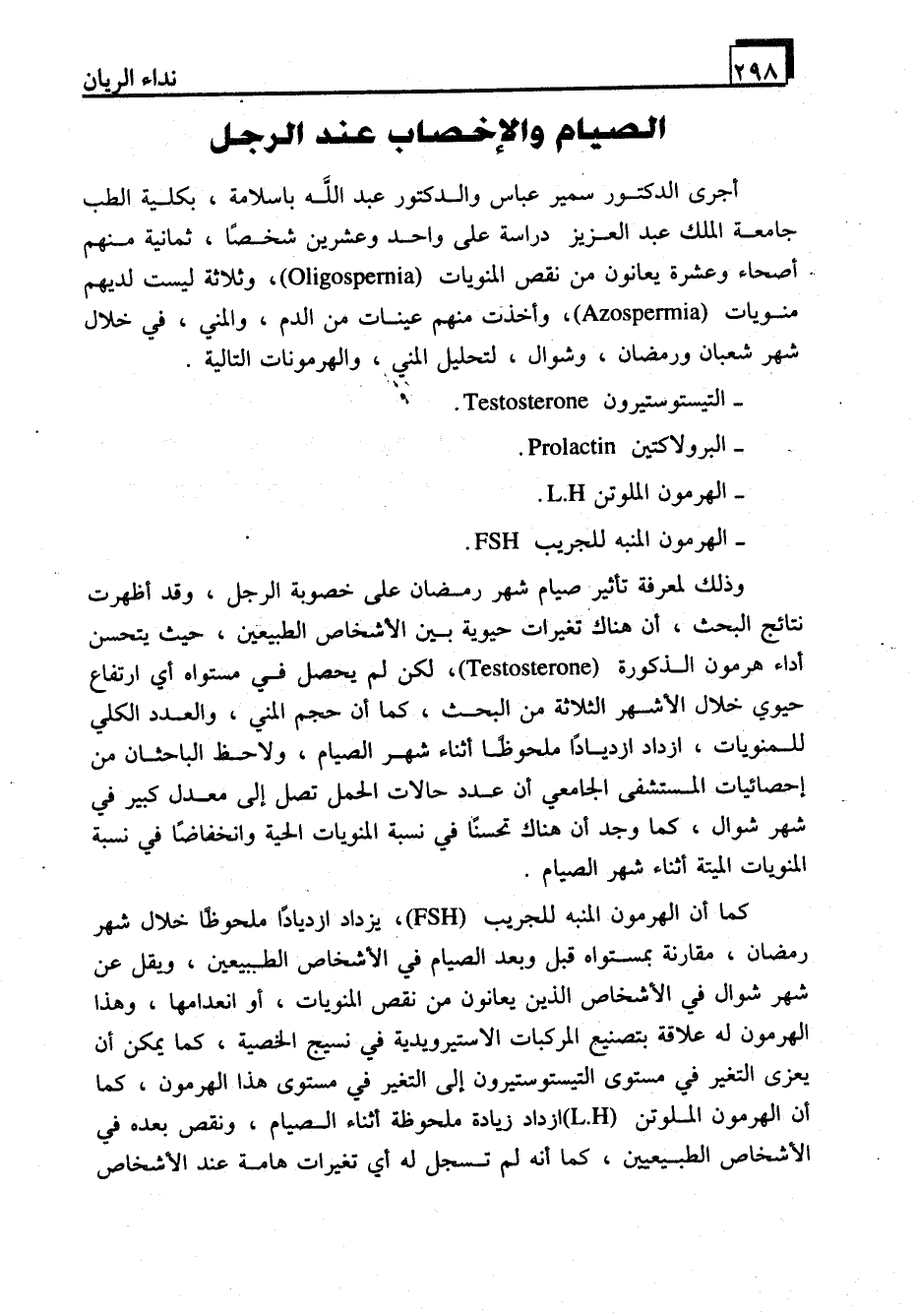 كما أن الهرمون المنبه للجريب (FSH) ، يزداد ازديادًا ملحوظًا خلال شهر رمضان، مقارنة بمستواه قبل وبعد الصيام في الأشخاص الطبيعيين، ويقل عن شهر شوال في الأشخاص الذين يعانون من نقص المنويات، أو انعدامها، وهذا الهرمون له علاقة بتصنيع المركبات الاستيرويدية في نسيج الخصية، كما يمكن أن يعزى التغير في مستوى التيستوستيرون إلى التغير في مستوى هذا الهرمون، كما أن الهرمون الملوتن (L.H) ازداد زيادة ملحوظة أثناء الصيام، ونقص بعده في الأشخاص الطبيعيين، كما أنه لم تسجل له أي تغيرات هامة عند الأشخاص