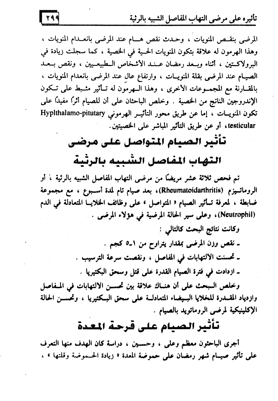تم فحص ثلاثة عشر مريضًا من مرضى التهاب المفاصل الشبيه بالرثية، أو الروماتيزم (Rheumatoidarthritis) ، بعد صيام تام لمدة أسبوع، مع مجموعة ضابطة، لمعرفة تأثير الصيام "المتواصل" على وظائف الخلايا المتعادلة في الدم (Neutrophil) ومحلى سير الحالة المرضية في هؤلاء المرضى.