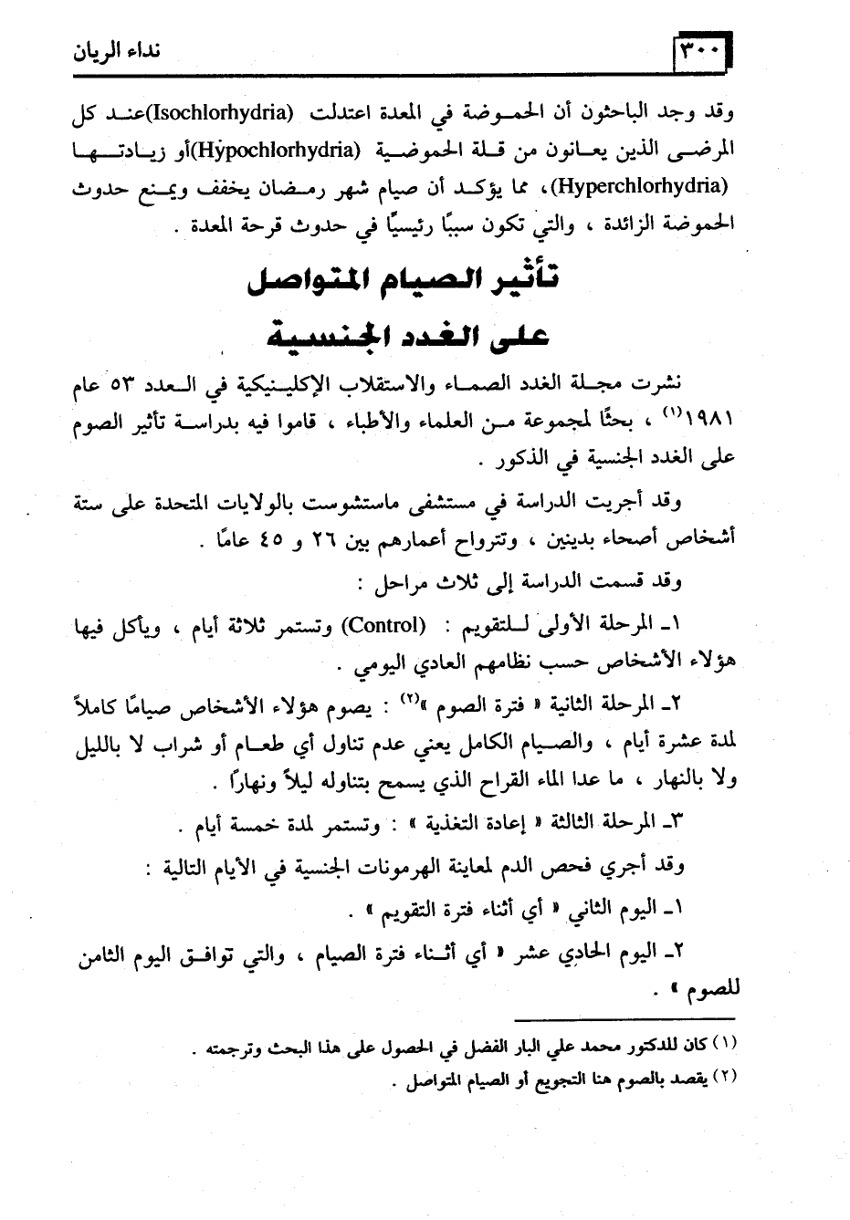 نشرت مجلة الغدد الصماء والاستقلاب الإكلينيكية في العدد 53 عام 1981م (1) ، بحثًا لمجموعة من العلماء والأطباء، قاموا فيه بدراسة تأثير الصوم على الغدد الجنسية في الذكور.