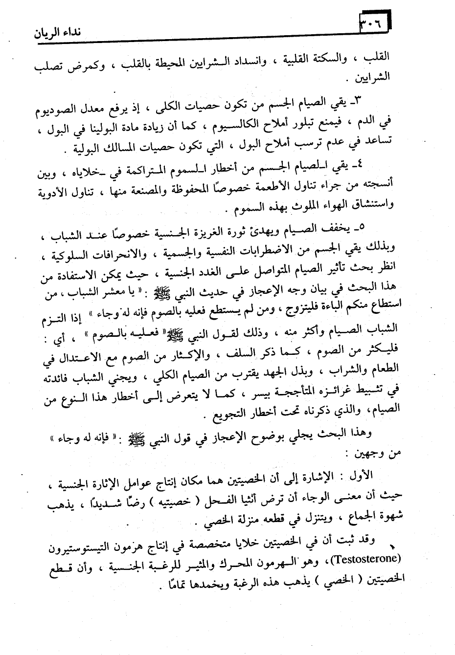 5- يخفف الصيام ويهدئ ثورة الغريزة الجنسية خصوصًا عند الشباب، وبذلك يقي الجسم من الاضطرابات النفسية والجسمية، والانحرافات السلوكية، انظر بحث تأثير الصيام المتواصل على الغدد الجنسية، حيث يمكن الاستفادة من هذا البحث في بيان وجه الإعجاز في حديث النبي - صَلَّى اللَّهُ عَلَيْهِ وَسَلَّمَ -: "يا معشر الشباب، من استطاع منكم الباءة فليتزوج، ومن لم يستطع فعليه بالصوم فإنه له وجاء" إذا التزم الشباب الصيام وأكثر منه، وذلك لقول النبي - صَلَّى اللَّهُ عَلَيْهِ وَسَلَّمَ - "فعليه بالصوم"، أي: فليكثر من الصوم، كما ذكر السلف، والإكثار من الصوم مع الاعتدال في الطعام والشراب، وبذل الجهد يقترب من الصيام الكلي، ويجني الشباب فائدته في تثبيط غرائزه المتأججة بيسر، ما لا يتعرض إلى أخطار هذا النوع من الصيام، والذي ذكرناه تحت أخطار التجويع.