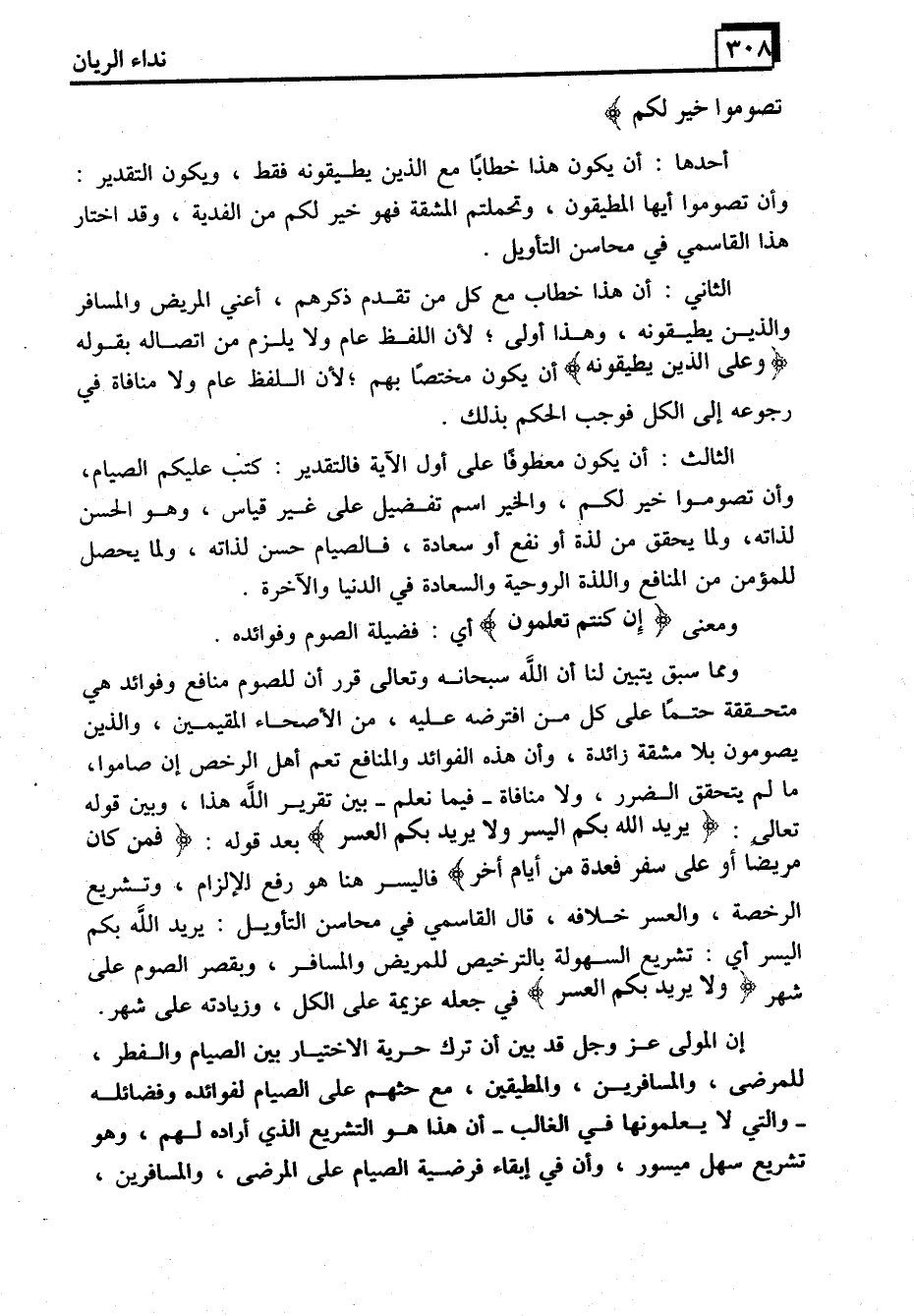 أحدها: أن يكون هذا خطابًا مع الذين يطيقونه فقط، ويكون التقدير: وأن تصوموا أيها المطيقون، وتحملتم المشقة فهو خير لكم من الفدية، وقد اختار هذا القاسمي في محاسن التأويل.