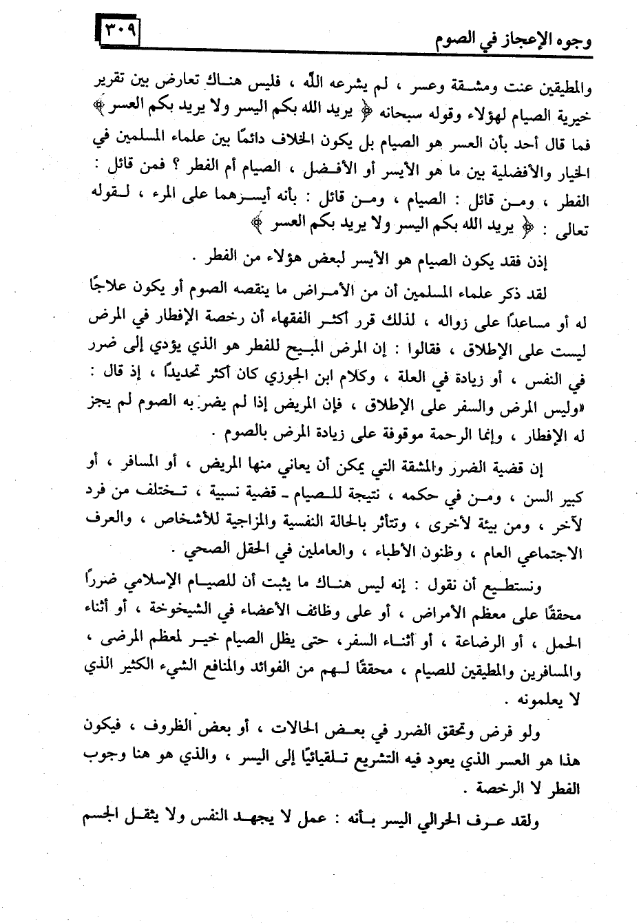 ونستطيع أن نقول: إنه ليس هناك ما يثبت أن للصيام الإسلامي ضررًا محققًا على معظم الأمراض، أو على وظائف الأعضاء في الشيخوخة، أو أثناء الحمل، أو الرضاعة، أو أثناء السفر، حتى يظل الصيام خير لمعظم المرضى، والمسافرين والمطيقين للصيام، محققًا لهم من الفوائد والمنافع الشيء الكثير الذي لا يعلمونه.