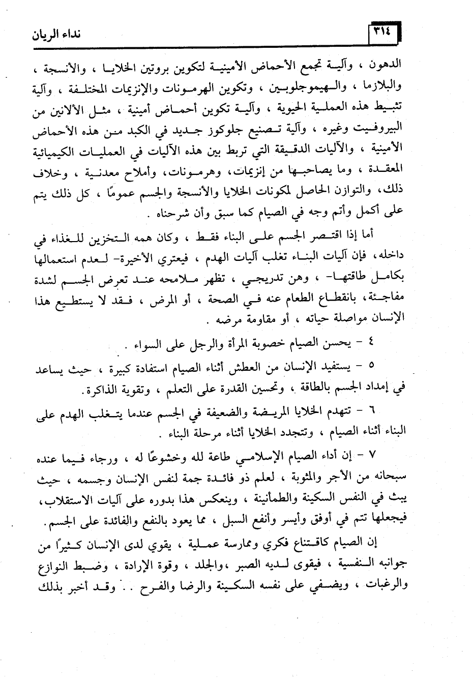 7- إن أداء الصيام الإسلامي طاعة لله وخشوعًا له، ورجاء فيما عنده سبحانه من الأجر والمثوبة، لعلم ذو فائدة جمة لنفس الإنسان وجسمه، حيث يبث في النفس السكينة والطمأنينة، وينعكس هذا بدوره على آليات الاستقلاب، فيجعلها تتم في أوفق وأيسر وأنفع السبل، مما يعود بالنفع والفائدة على الجسم.