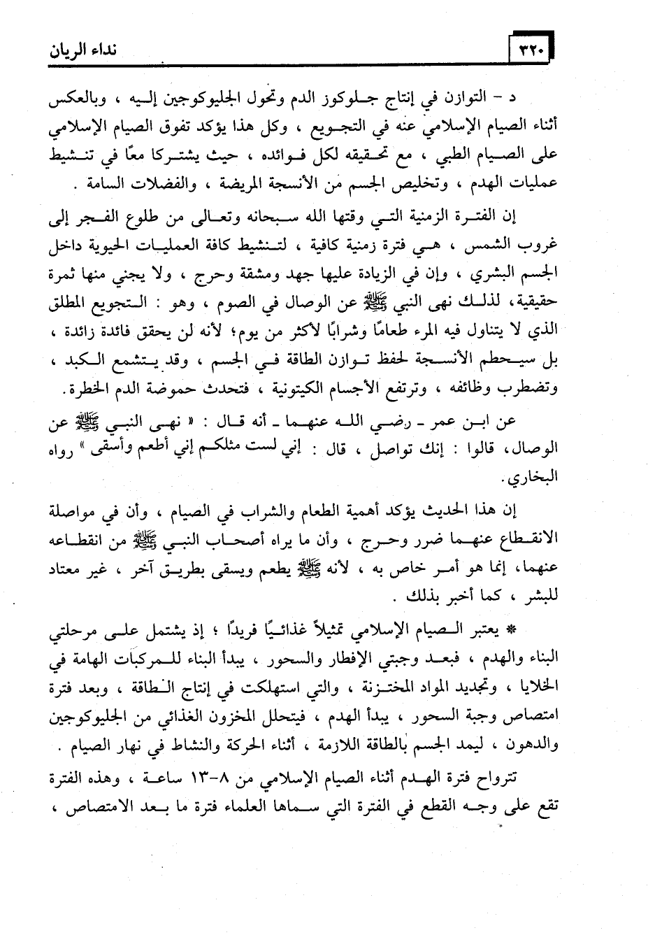 د- التوازن في إنتاج جلوكوز الدم وتحول الجليوكوجين إليه، وبالعكس أثناء الصيام الإسلامي عنه في التجويع، وكل هذا يؤكد تفوق الصيام الإسلامي على الصيام الطبي، مع تحقيقه لكل فوائده، حيث يشتركا معًا في تنشيط عمليات الهدم، وتخليص الجسم من الأنسجة المريضة، والفضلات السامة.