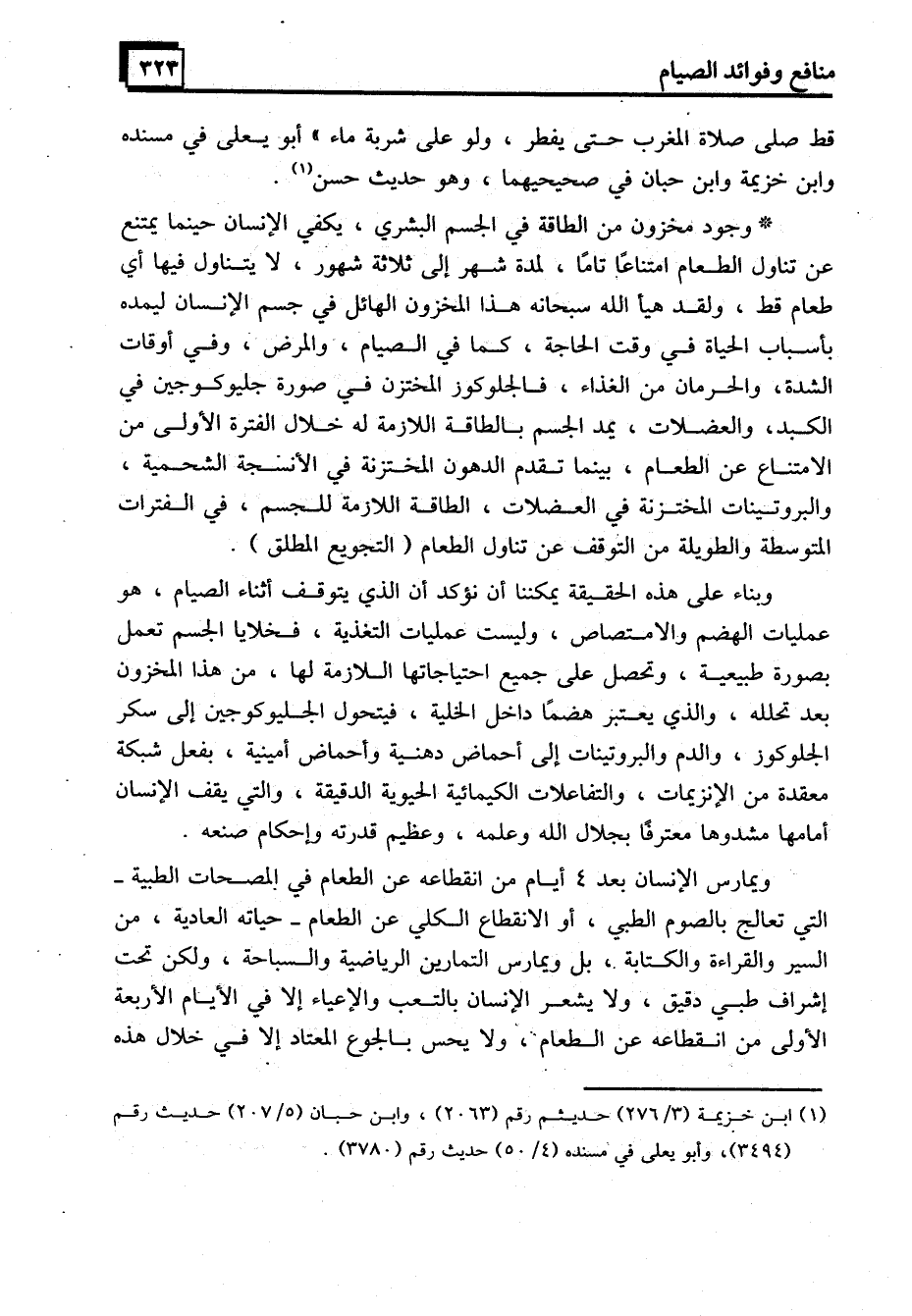 * وجود مخزون من الطاقة في الجسم البشري، يكفي الإنسان حينما يمتنع عن تناول الطعام امتناعًا تامًا، لمدة شهر إلى ثلاثة شهور، لا يتناول فيها أي طعام قط، ولقد هيأ الله سبحانه هذا المخزون الهائل في جسم الإنسان ليمده بأسباب الحياة في وقت الحاجة، كما في الصيام، والمرض وفي أوقات الشدة، والحرمان من الغذاء، فالجلوكوز المختزن في صورة جليوكوجين في الكبد، والعضلات، يمد الجسم بالطاقة اللازمة له خلال الفترة الأولى من الامتناع عن الطعام، بينما تقدم الدهون المختزنة في الأنسجة الشحمية، والبروتينات المختزنة في العضلات، الطاقة اللازمة للجسم، في الفترات المتوسطة والطويلة من التوقف عن تناول الطعام (التجويع المطلق) .