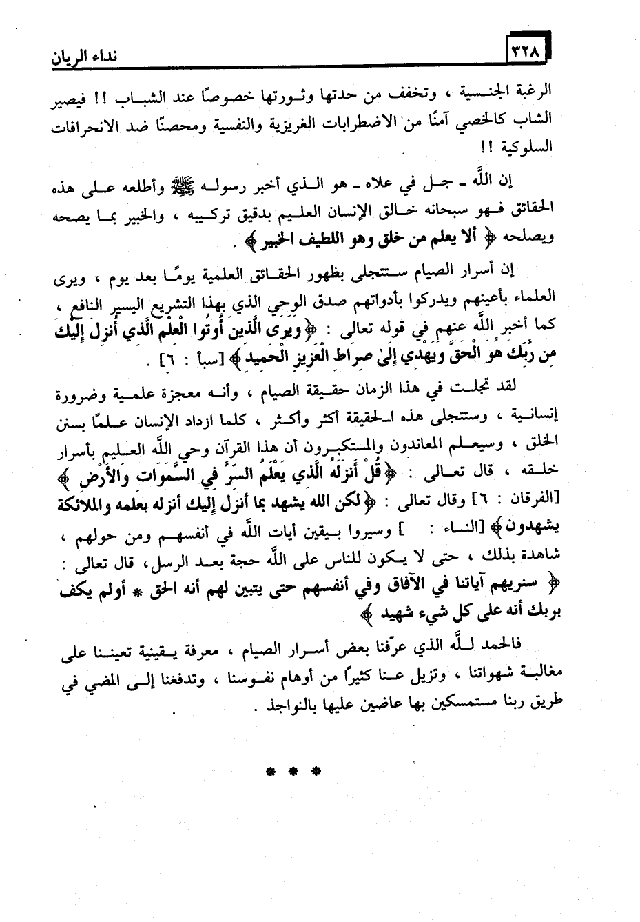 فالحمد لله الذي عرّفنا بعض أسرار الصيام، معرفة يقينية تعيننا على مغالبة شهواتنا، وتزيل عنا كثير، من أوهام نفوسنا، وتدفعنا إلى المضي في طريق ربنا مستمسكين بها عاضين عليها بالنواجذ.