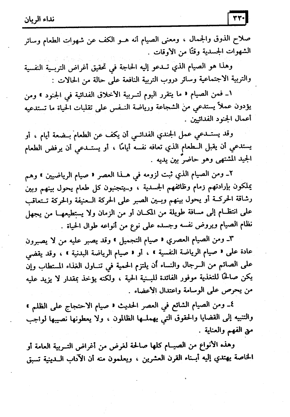 وهذه الأنواع من الصيام كلها صالحة لغرض من أغراض التربية العامة أو الخاصة يهتدي إليه أبناء القرن العشرين، ويعلمون منه أن الآداب الدينية تسبق
