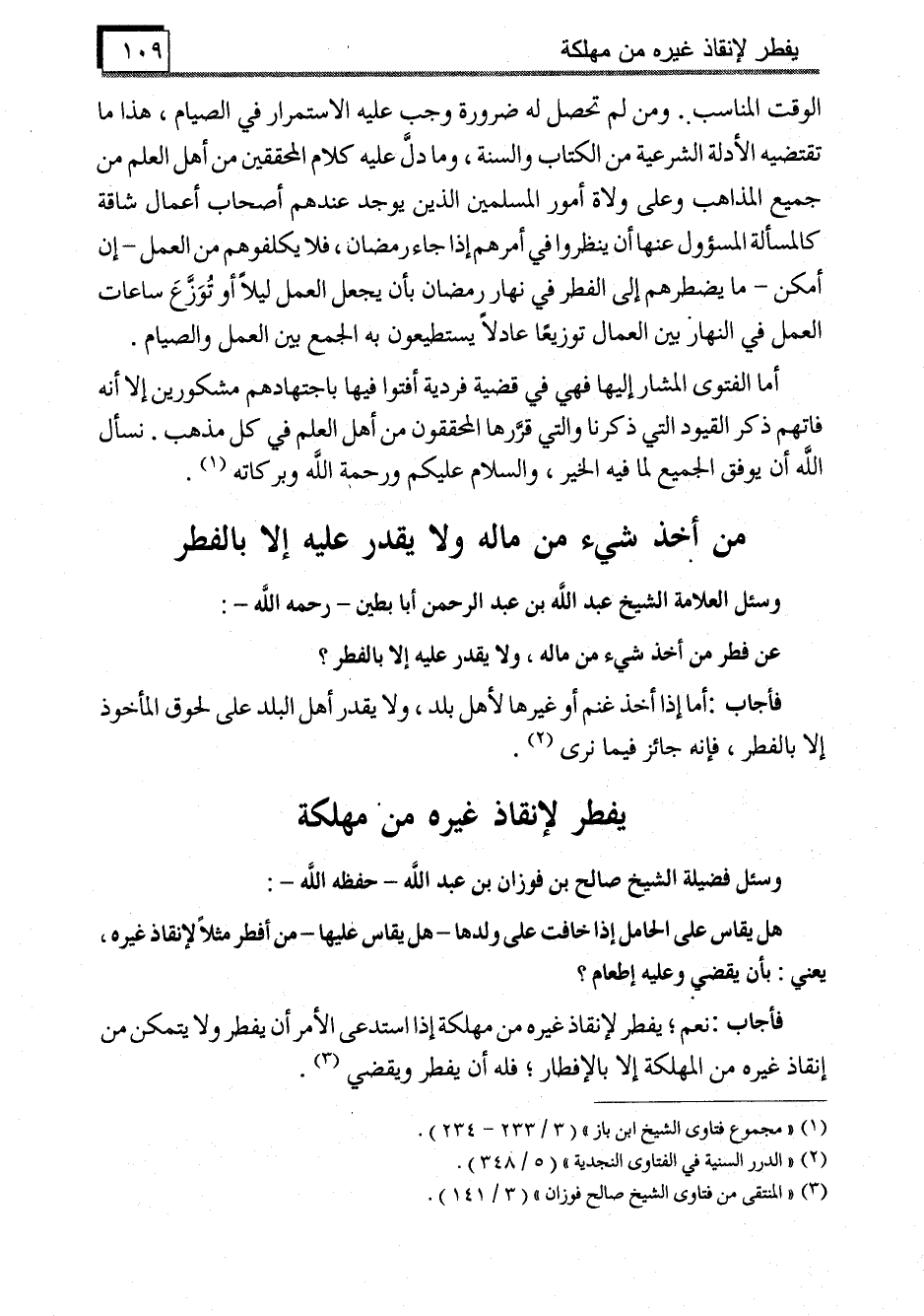 فأجاب: نعم؛ يفطر لإنقاذ غيره من مهلكة إذا استدعى الأمر أن يفطر ولا يتمكن من إنقاذ غيره من المهلكة إلا بالإفطار؛ فله أن يفطر ويقضي (3) .