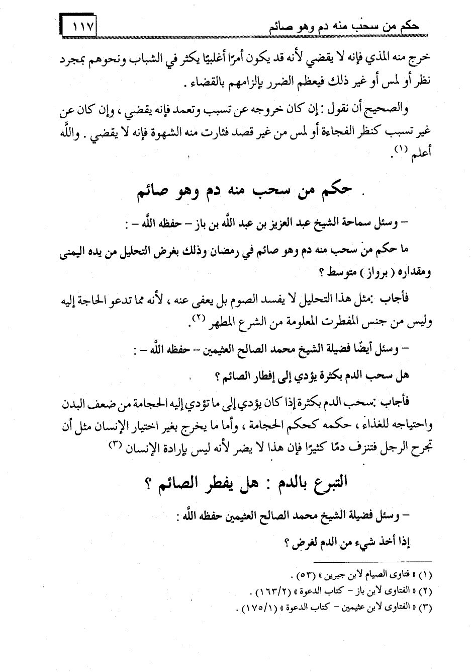 فأجاب: سحب الدم بكثرة إذا كان يؤدي إلى ما تؤدي إليه الحجامة من ضعف البدن واحتياجه للغذاء، حكمه كحكم الحجامة، وأما ما يخرج بغير اختيار الإنسان مثل أن تجرح الرجل فتنزف دما كثيرا فإن هذا لا يضر لأنه ليس بإرادة الإنسان (3)