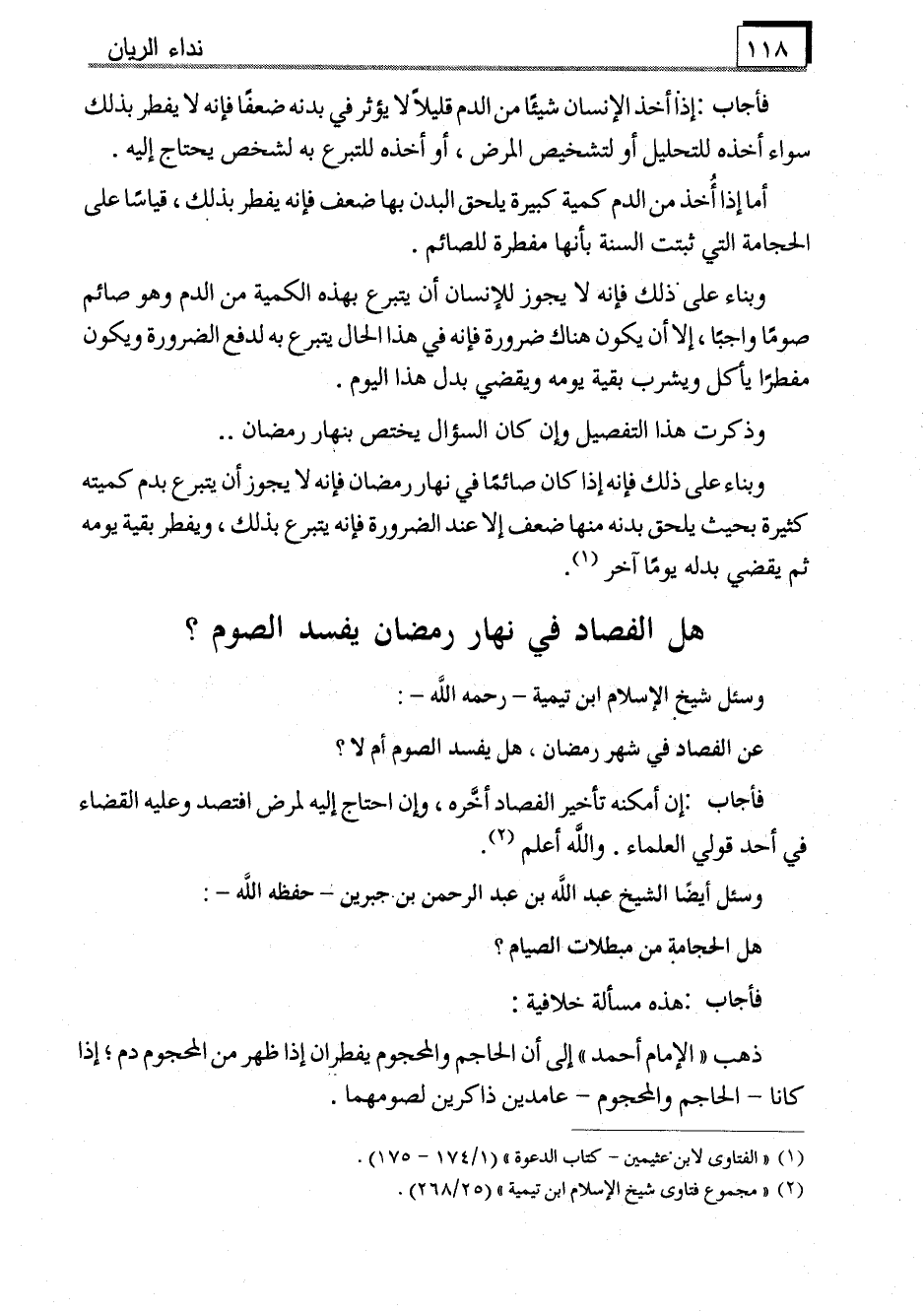 فأجاب: إن أمكنه تأخير الفصاد أخَّره، وإن احتاج إليه لمرض افتصد وعليه القضاء في أحد قولي العلماء. والله أعلم (2) .