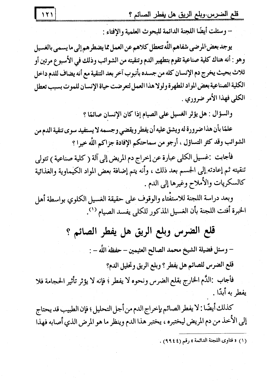 وبعد دراسة اللجنة للاستفتاء والوقوف على حقيقة الغسيل الكلوي بواسطة أهل الخبرة أفتت اللجنة بأن الغسيل المذكور للكلى يفسد الصيام (1) .