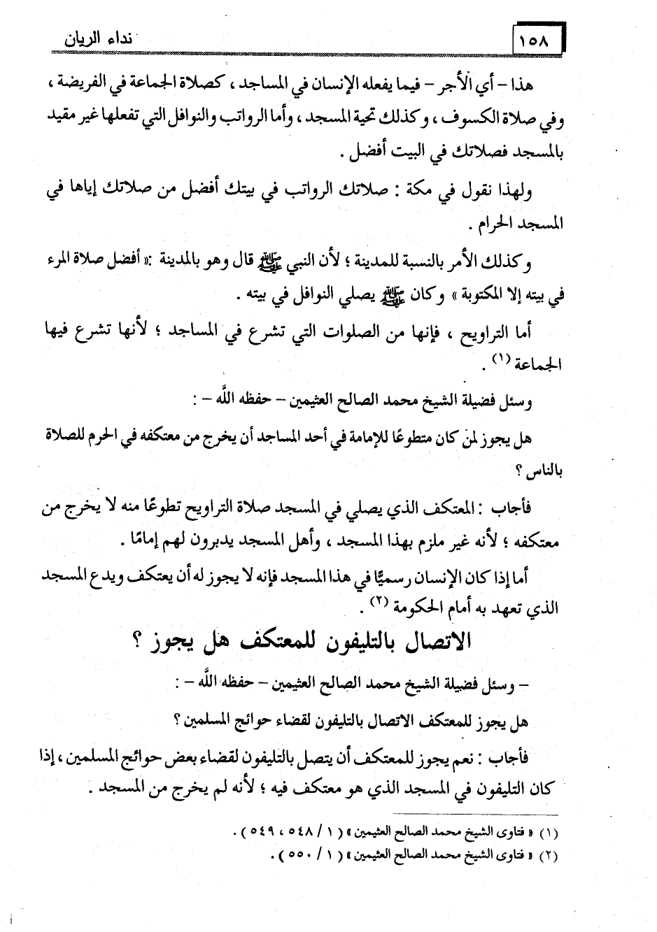 فأجاب: نعم يجوز للمعتكف أن يتصل بالتليفون لقضاء بعض حوائج المسلمين، إذا كان التليفون في المسجد الذي هو معتكف فيه؛ لأنه لم يخرج من المسجد.