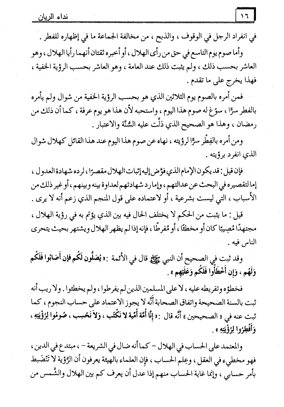 فخطؤه وتفريطه عليه، لا على المسلمين الذين لم يفرطوا، ولم يخطئوا. ولا ريب أنه ثبت بالسنة الصحيحة واتفاق الصحابة أَنَّه لا يجوز الاعتماد على حساب النجوم، كما ثبت عنه في "الصحيحين" أنَّه قال: "إِنا أُمة أُمية لا نَكْتُب، وَلاَ نَحْسِب، صُومُوا لِرُؤْيتهِ، وَأَفْطِرُوا لِرُؤْيَتهِ".