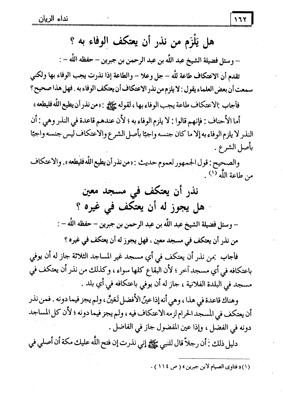 فأجاب: من نذر أن يعتكف في أي مسجد غير المساجد الثلاثة جاز له أن يوفي باعتكافه في أي مسجد آخر، لأن البقاع كلها سواء، وكذلك من نذر أن يعتكف في مسجد في البلدة الفلانية، جاز له أن يوفي باعتكافه في، أي بلد.