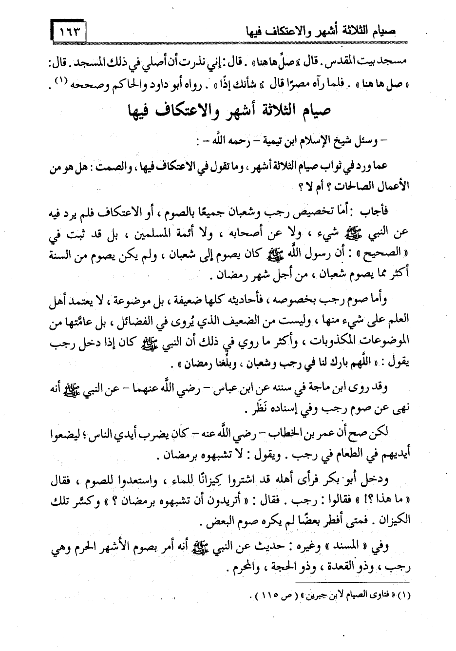 فأجاب: أما تخصيص رجب وشعبان جميعًا بالصوم، أو الاعتكاف فلم يرد فيه عن النبي - صَلَّى اللَّهُ عَلَيْهِ وَسَلَّمَ - شيء، ولا عن أصحابه، ولا أئمة المسلمين، بل قد ثبت في "الصحيح": أن رسول الله - صَلَّى اللَّهُ عَلَيْهِ وَسَلَّمَ - كان يصوم إلى شعبان، ولم يكن يصوم من السنة أكثر مما يصوم شعبان، من أجل شهر رمضان.