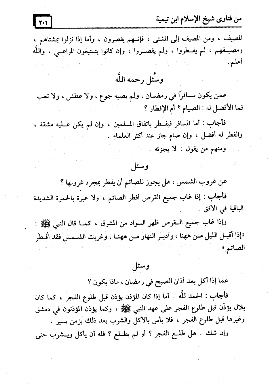 فأجاب: الحمد لله. أما إذا كان المؤذن يؤذن قبل طلوع الفجر، كما كان بلال يؤذّن قبل طلوع الفجر على عهد النبي - صَلَّى اللَّهُ عَلَيْهِ وَسَلَّمَ -، وكما يؤذن المؤذنون في دمشق وغيرها قبل طلوع الفجر، فلا بأس بالأكل والشرب بعد ذلك بزمن يسير.
