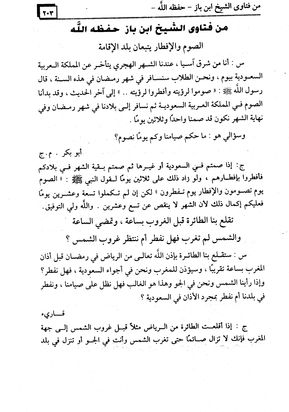 ج: إذا أقلعت الطائرة عن الرياض مثلاً قبل غروب الشمس إلى جهة المغرب فإنك لا تزال صائمًا حتى تغرب الشمس وأنت في الجو أو تنزل في بلد