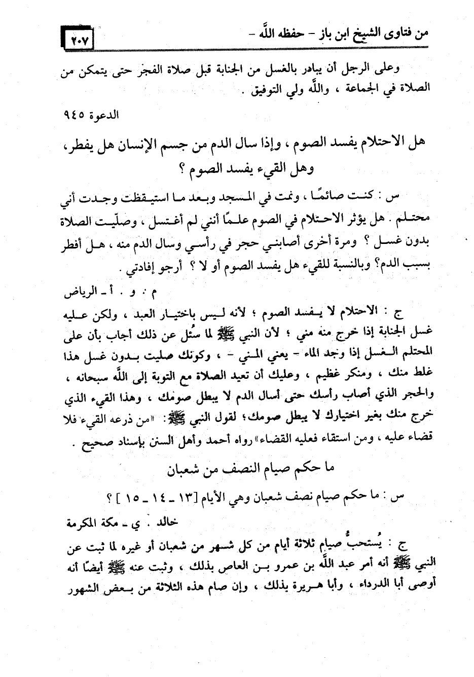 س: كنت صائمًا، ونمت في المسجد وبعد ما استيقظت وجدت أني محتلم. هل يؤثر الاحتلام في الصوم علمًا أنني لم أغتسل، وصلّيت الصلاة بدون غسل؟ ومرة أخرى أصابني حجر في رأسي وسال الدم منه، هل أفطر بسبب الدم؟ وبالنسبة للقيء هل يفسد الصوم أو لا؟ أرجو إفادتي.