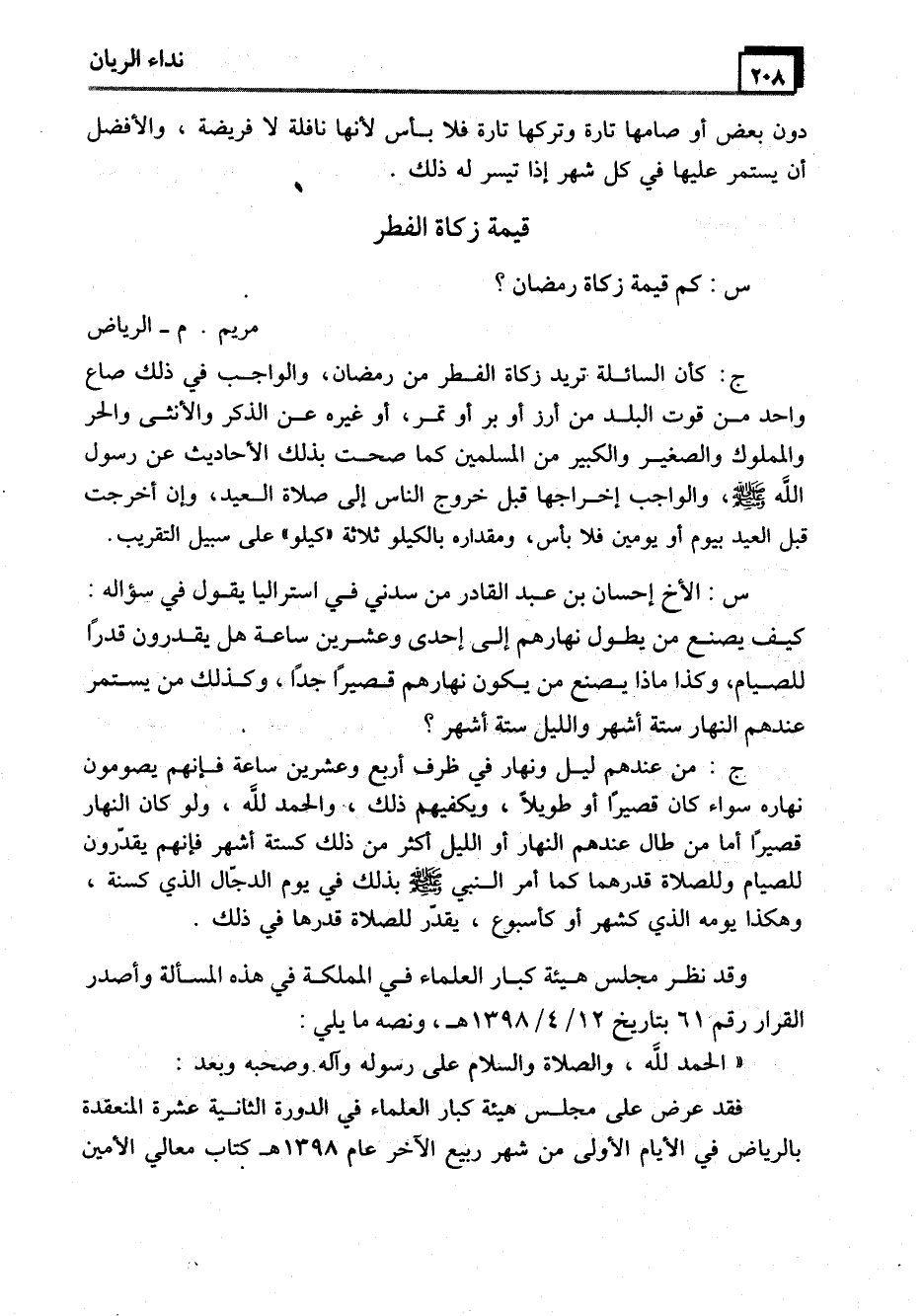 ج: كأن السائلة تريد زكاة الفطر من رمضان، والواجب في ذلك صاع واحد من قوت البلد من أرز أو بر أو تمر، أو غيره عن الذكر والأنثى والحر والمملوك والصغير والكبير من المسلمين كما صحت بذلك الأحاديث عن رسول الله - صَلَّى اللَّهُ عَلَيْهِ وَسَلَّمَ -، والواجب إخراجها قبل خروج الناس إلى صلاة العيد، وإن أخرجت قبل العيد بيوم أو يومين فلا بأس، ومقداره بالكيلو ثلاثة "كيلو" على سبيل التقريب.