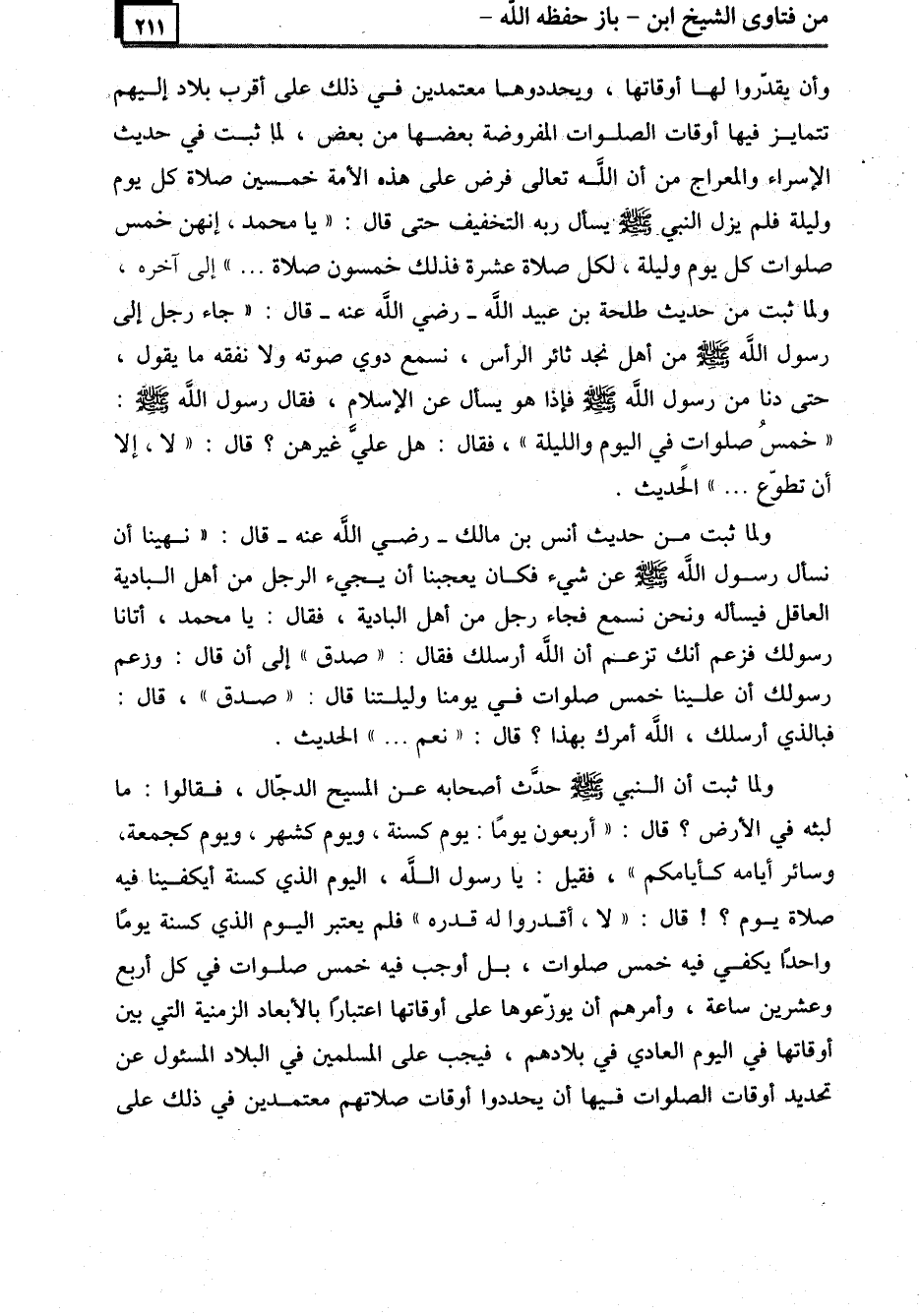 وأن يقدّروا لها أوقاتها، ويحددوها معتمدين في ذلك على أقرب بلاد إليهم تتمايز فيها أوقات الصلوات المفروضة بعضها من بعض، لما ثبت في حديث الإسراء والمعراج من أن الله تعالى فرض على هذه الأمة خمسين صلاة كل يوم وليلة فلم يزل النبي - صَلَّى اللَّهُ عَلَيْهِ وَسَلَّمَ - يسأل ربه التخفيف حتى قال: "يا محمد، إنهن خمس صلوات كل يوم وليلة، لكل صلاة عشرة فذلك خمسون صلاة ... " إلى آخره، ولما ثبت من حديث طلحة بن عبيد الله -رضي الله عنه- قال: "جاء رجل إلى رسول الله - صَلَّى اللَّهُ عَلَيْهِ وَسَلَّمَ - من أهل نجد ثائر الرأس، نسمع دوي صوته ولا نفقه ما يقول، حتى دنا من رسول الله - صَلَّى اللَّهُ عَلَيْهِ وَسَلَّمَ - فإذا هو يسأل عن الإسلام، فقال رسول الله - صَلَّى اللَّهُ عَلَيْهِ وَسَلَّمَ -: "خمسُ صلوات في اليوم والليلة"، فقال: هل عليَّ غيرهن؟ قال: "لا، إلا أن تطوع ... " الحديث.