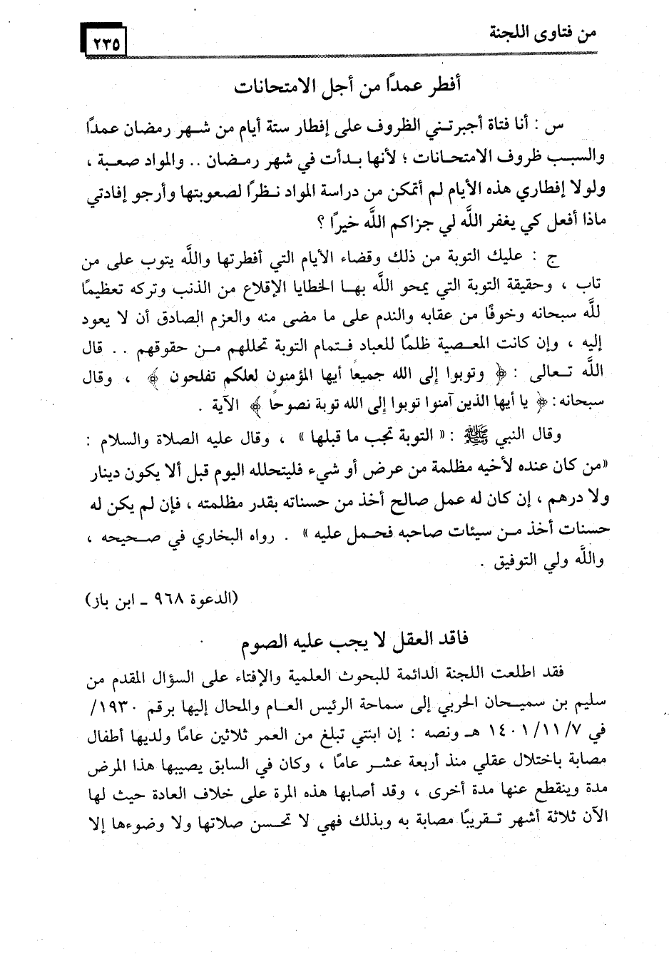 فقد اطلعت اللجنة الدائمة للبحوث العلمية والإفتاء على السؤال المقدم من سليم بن سميحان الحربي إلى سماحة الرئيس العام والمحال إليها برقم 1930/ في 7/11/1401هـ ونصه: إن ابنتي تبلغ من العمر ثلاثين عامًا ولديها أطفال مصابة باختلال عقلي منذ أربعة عشر عامًا، وكان في السابق يصيبها هذا المرض مدة وينقطع عنها مدة أخرى، وقد أصابها هذه المرة على خلاف العادة حيث لها الآن ثلاثة أشهر تقريبًا مصابة به وبذلك فهي لا تحسن صلاتها ولا وضوءها إلا