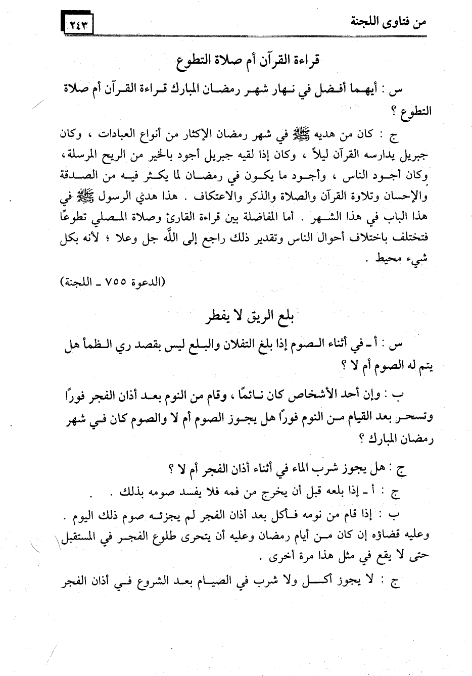 س: أيهما أفضل في نهار شهر رمضان المبارك قراءة القرآن أم صلاة التطوع؟
