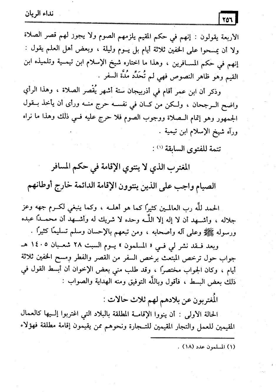وبعد فقد نشر لي في "المسلمون" يوم السبت 28 شعبان 1405هـ جواب حول ترخص المبتعث برخص السفر من القصر والفطر ومسح الخفين ثلاثة أيام، وكان الجواب مختصرًا، وقد طلب مني بعض الإخوان أن أبسط القول في ذلك بعض البسط، فأقول وبالله التوفيق ومنه الهداية والصواب: