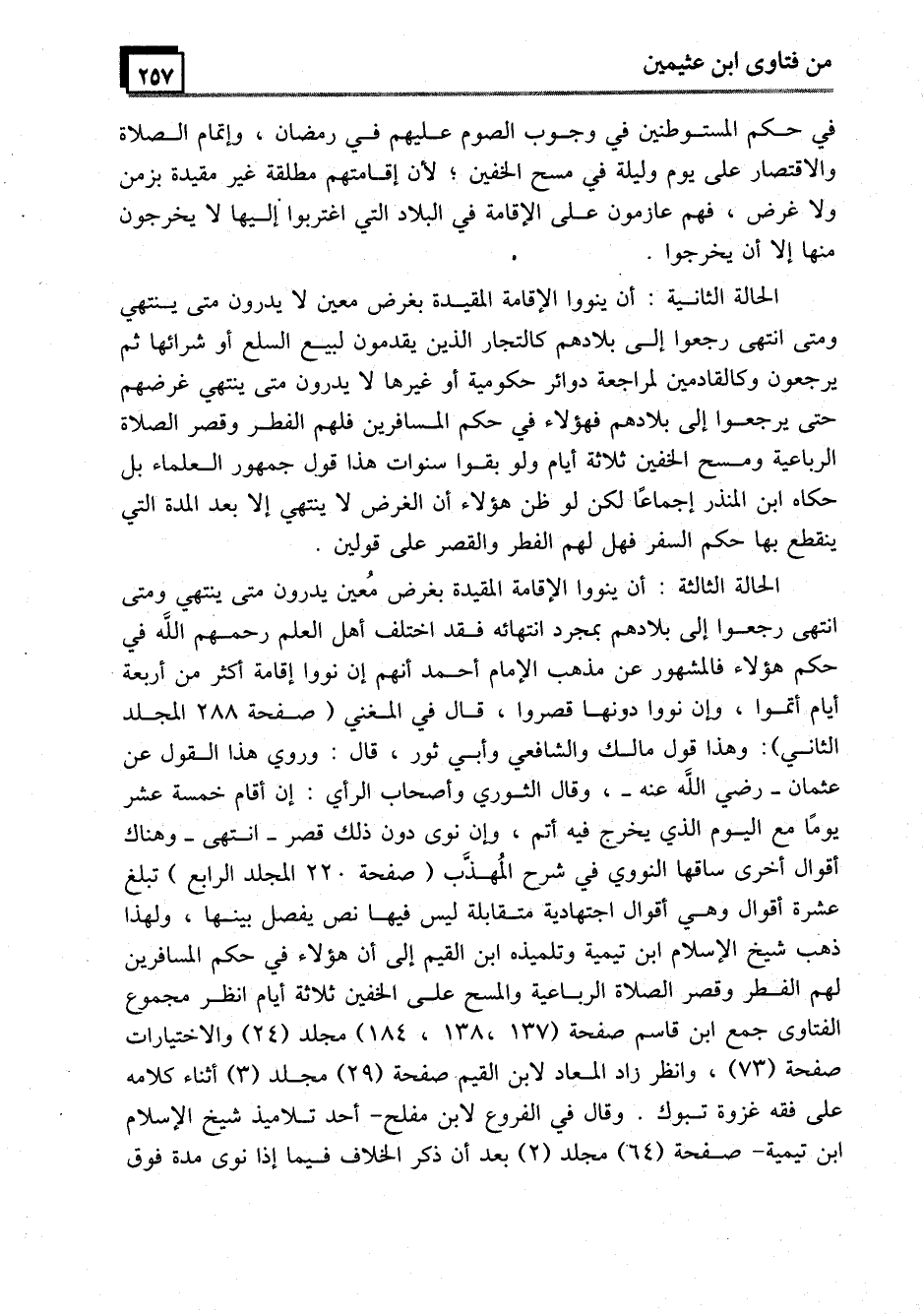 الحالة الثالثة: أن ينووا الإقامة المقيدة بغرض مُعين يدرون متى ينتهي ومتى انتهى رجعوا إلى بلادهم بمجرد انتهائه فقد اختلف أهل العلم رحمهم الله في حكم هؤلاء فالمشهور عن مذهب الإمام أحمد أنهم إن نووا إقامة أكثر من أربعة أيام أتموا، وإن نووا دونها قصروا، قال في المغني (صفحة 288 المجلد الثاني) : وهذا قول مالك والشافعي وأبي ثور، قال: وروي هذا القول عن عثمان -رضي الله عنه-، وقال الثوري وأصحاب الرأي: إن أقام خمسة عشر يومًا مع اليوم الذي يخرج فيه أتم، وإن نوى دون ذلك قصر -انتهى- وهناك أقوال أخرى ساقها النووي في شرح المُهذَّب (صفحة 220 المجلد الرابع) تبلغ عشرة أقوال وهي أقوال اجتهادية متقابلة ليس فيها نص يفصل بينها، ولهذا ذهب شيخ الإسلام ابن تيمية وتلميذه ابن القيم إلى أن هؤلاء في حكم المسافرين لهم الفطر وقصر الصلاة الرباعية والمسح على الخفين ثلاثة أيام انظر مجموع الفتاوى جمع ابن قاسم صفحة (137، 138، 184) مجلد (24) والاختيارات صفحة (73) ، وانظر زاد المعاد لابن القيم صفحة (29) مجلد (3) أثناء كلامه على فقه غزوة تبوك. وقال في الفروع لابن مفلح -أحد تلاميذ شيخ الإسلام ابن تيمية- صفحة (64) مجلد (2) بعد أن ذكر الخلاف فيما إذا نوى مدة فوق