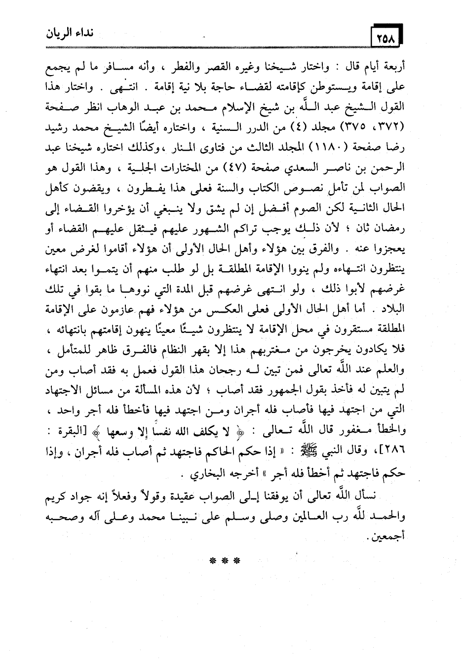 أربعة أيام قال: واختار شيخنا وغيره القصر والفطر، وأنه مسافر ما لم يجمع على إقامة ويستوطن كإقامته لقضاء حاجة بلا نية إقامة. انتهى. واختار هذا القول الشيخ عبد الله بن شيخ الإسلام محمد بن عبد الوهاب انظر صفحة (372، 375) مجلد (4) من الدرر السنية، واختاره أيضًا الشيخ محمد رشيد رضا صفحة (1180) المجلد الثالث من فتاوى المنار، وكذلك اختاره شيخنا عبد الرحمن بن ناصر السعدي صفحة (47) من المختارات الجلية، وهذا القول هو الصواب لمن تأمل نصوص الكتاب والسنة فعلى هذا يفطرون، ويمّضون كأهل الحال الثانية لكن الصوم أفضل إن لم يشق ولا ينبغي أن يؤخروا القضاء إلى رمضان ثان؛ لأن ذلك يوجب تراكم الشهور عليهم فيثقل عليهم القضاء أو يعجزوا عنه. والفرق بين هؤلاء وأهل الحال الأولى أن هؤلاء أقاموا لغرض معين ينتظرون انتهاءه ولم ينووا الإقامة المطلقة بل لو طلب منهم أن يتموا بعد انتهاء غرضهم لأبوا ذلك، ولو انتهى غرضهم قبل المدة التي نووها ما بقوا في تلك البلاد. أما أهل الحال الأولى فعلى العكس من هؤلاء فهم عازمون على الإقامة المطلقة مستقرون في محل الإقامة لا ينتظرون شيئًا معينًا ينهون إقامتهم بانتهائه، فلا يكادون يخرجون من مغتربهم هذا إلا بقهر النظام فالفرق ظاهر للمتأمل، والعلم عند الله تعالى فمن تبين له رجحان هذا القول فعمل به فقد أصاب ومن لم يتبين له فأخذ بقول الجمهور فقد أصاب؛ لأن هذه المسألة من مسائل الاجتهاد التي من اجتهد فيها فأصاب فله أجران ومن اجتهد فيهاِ فأخطأ فله أجر واحد، والخطأ فور قال الله تعالى: (لا يكلف الله نفسًا إِلا وسعها) [البقرة: 286] ، وقال النبي - صَلَّى اللَّهُ عَلَيْهِ وَسَلَّمَ -: "إذا حكم الحاكم فاجتهد ثم أصاب فله أجران، وإذا حكم فاجتهد ثم أخطأ فله أجر" أخرجه البخاري.