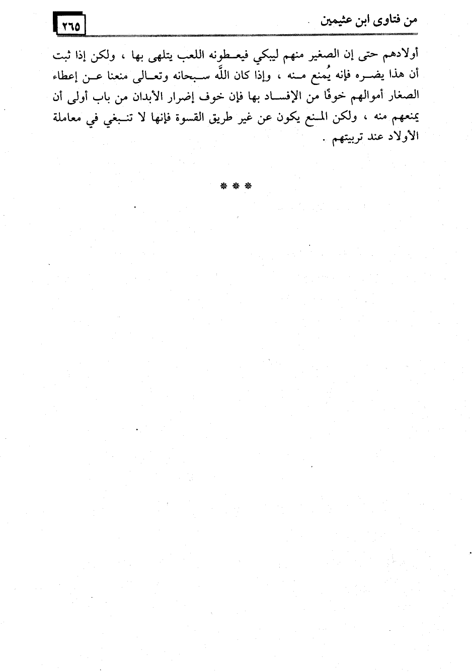 أولادهم حتى إن الصغير منهم ليبكي فيعطونه اللعب يتلهى بها، ولكن إذا ثبت أن هذا يضره فإنه يُمنع منه، وإذا كان الله سبحانه وتعالى منعنا عن إعطاء الصغار أموالهم خوفًا من الإفساد بها فإن خوف إضرار الأبدان من باب أولى أن يمنعهم منه، ولكن المنع يكون عن غير طريق القسوة فإنها لا تنبغي في معاملة الأولاد عند تربيتهم.