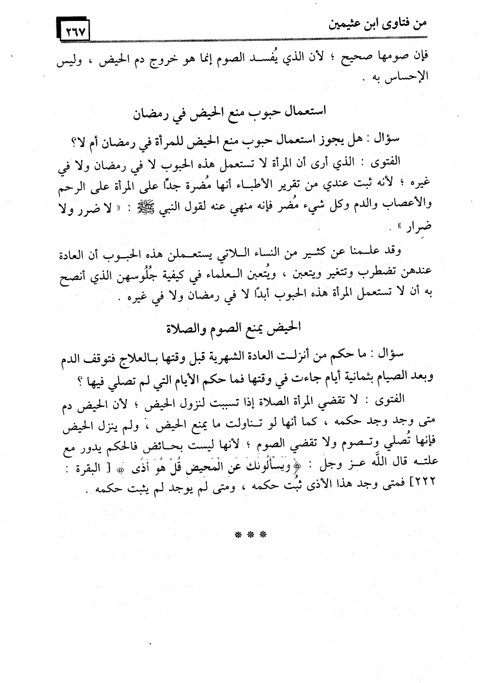 الفتوى: الذي أرى أن المرأة لا تستعمل هذه الحبوب لا في رمضان ولا في غيره؛ لأنه ثبت عندي من تقرير الأطباء أنها مُضرة جدا على المرأة على الرحم والأعصاب والدم وكل شيء مُضر فإنه منهي عنه لقول النبي - صَلَّى اللَّهُ عَلَيْهِ وَسَلَّمَ -: "لا ضرر ولا ضِرار".