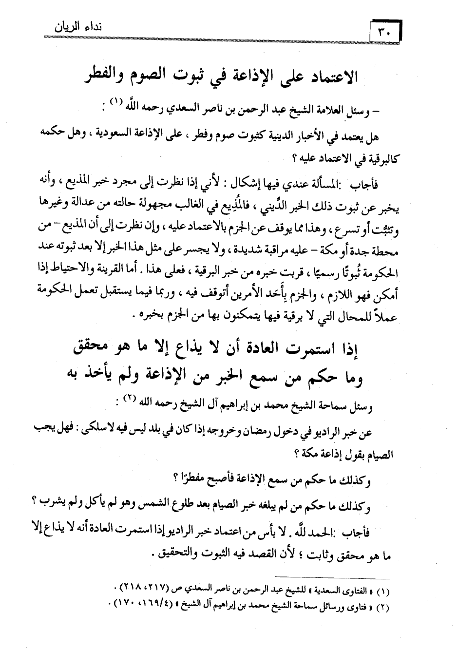 فأجاب: المسألة عندي فيها إشكال: لأني إذا نظرت إلى مجرد خبر المذيع، وأنه يخبر عن ثبوت ذلك الخبر الدِّيني، فالمُذِيع في الغالب مجهولة حالته من عدالة وغيرها وتثبت أو تسرع، وهذا مما يوقف عن الجزم بالاعتماد عليه، وإن نظرت إلى أن المذيع -من محطة جدة أو مكة- عليه مراقبة شديدة، ولا يجسر على مثل هذا الخبر إلا بعد ثبوته عند الحكومة ثُبوتًا رسميا، قربت خبره من خبر البرقية، فعلى هذا. أما القرينة والاحتياط إذا أمكن فهو اللازم، والجزم بِأَحَد الأمرين أتوقف فيه، وربما فيما يستقبل تعمل الحكومة عملا للمحال التي لا برقية فيها يتمكنون بها من الجزم بخبره.