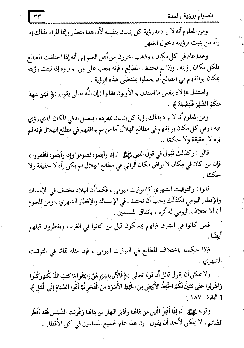 وهذا عام في كل مكان، وذهب آخرون من أهل العلم إلى أنه إذا اختلفت المطالع فلكل مكان رؤيته. وإذا لم تختلف المطالع، فإنه يجب على من لم يروه إذا ثبتت رؤيته بمكان يوافقهم في المطالع أن يعملوا بمقتضى هذه الرؤية.