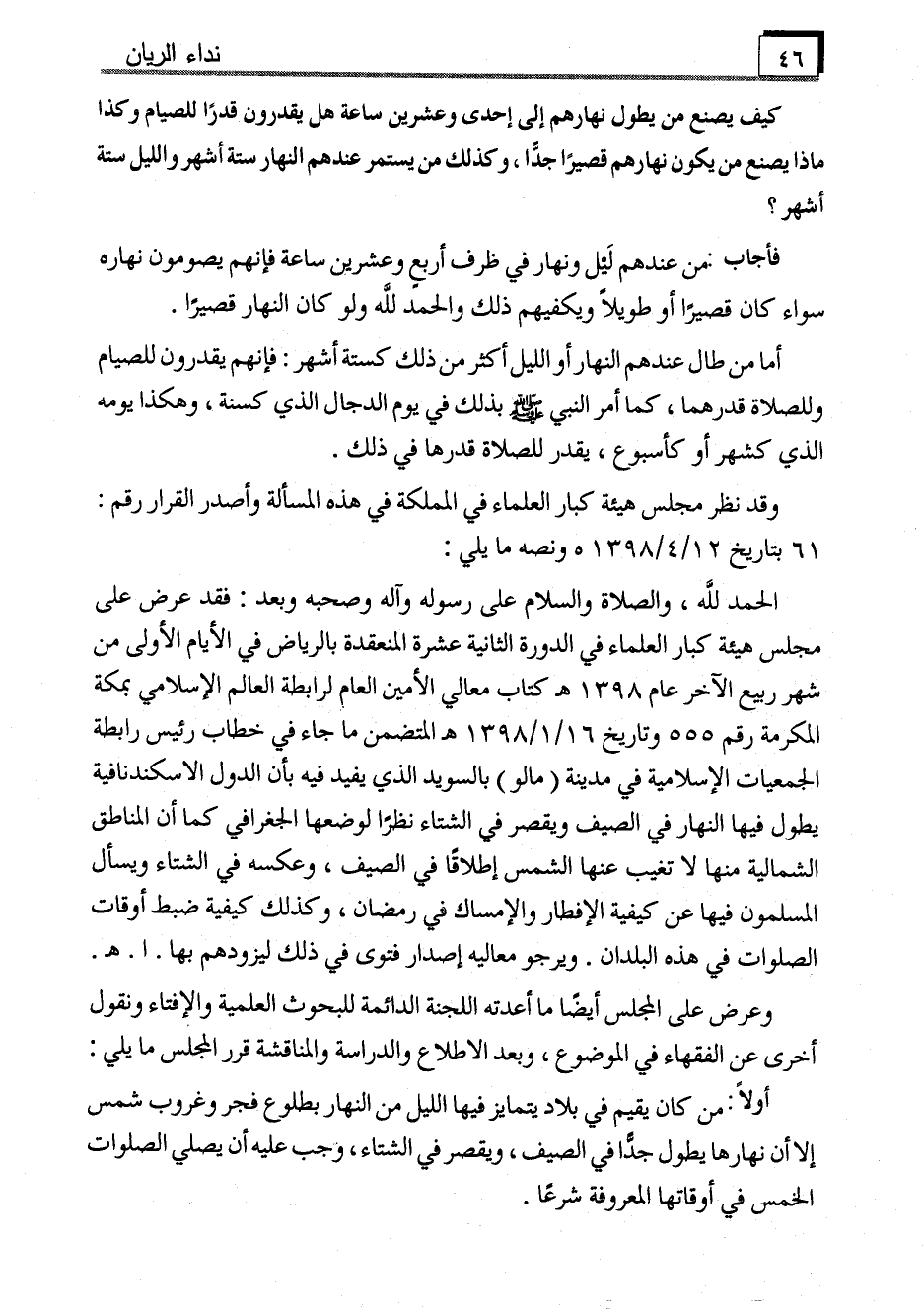 الحمد لله، والصلاة والسلام على رسوله وآله وصحبه وبعد: فقد عرض على مجلس هيئة كبار العلماء في الدورة الثانية عشرة المنعقدة بالرياض في الأيام الأولى من شهر ربيع الآخر عام 1398هـ كتاب معالي الأمين العام لرابطة العالم الإسلامي بمكة المكرمة رقم 555 وتاريخ 16/1/1398هـ المتضمن ما جاء في خطاب رئيس رابطة الجمعيات الإسلامية في مدينة (مالو) بالسويد الذي يفيد فيه بأن الدول الاسكندنافية يطول فيها النهار في الصيف ويقصر في الشتاء نظرًا لوضعها الجغرافي كما أن المناطق الشمالية منها لا تغيب عنها الشمس إطلاقًا في الصيف، وعكسه في الشتاء ويسأل المسلمون فيها عن كيفية الإفطار والإمساك في رمضان، وكذلك كيفية ضبط أوقات الصلوات في هذه البلدان. ويرجو معاليه إصدار فتوى في ذلك ليزودهم بها. ا. هـ.